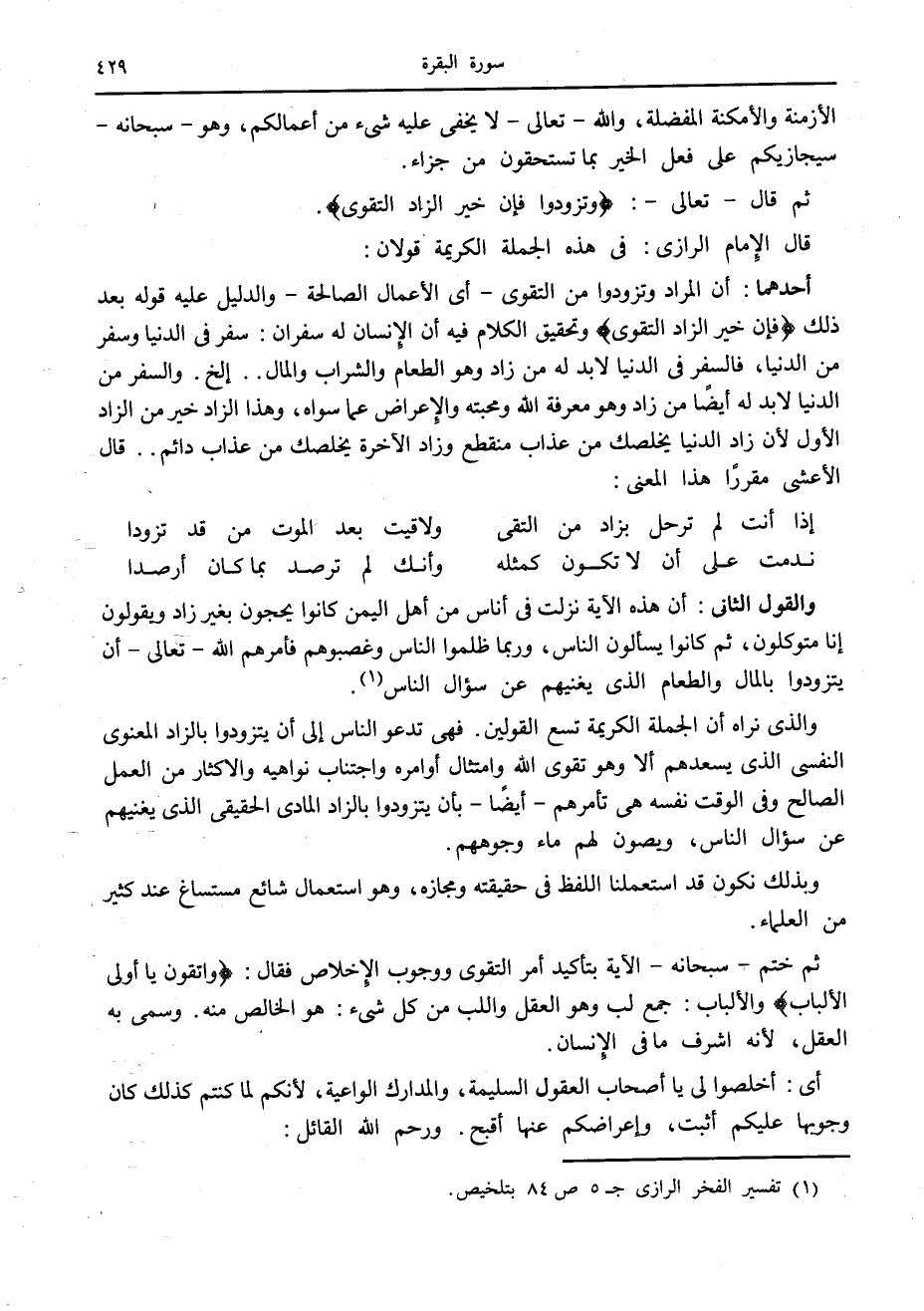 أحدهما: أن المراد وتزودوا من التقوى- أى الأعمال الصالحة- والدليل عليه قوله بعد ذلك فَإِنَّ خَيْرَ الزَّادِ التَّقْوى وتحقيق الكلام فيه أن الإنسان له سفران: سفر في الدنيا وسفر من الدنيا، فالسفر في الدنيا لا بد له من زاد وهو الطعام والشراب والمال.. إلخ. والسفر من الدنيا لا بد له أيضا من زاد وهو معرفة الله ومحبته والإعراض عما سواه، وهذا الزاد خير من الزاد الأول لأن زاد الدنيا يخلصك من عذاب منقطع وزاد الآخرة يخلصك من عذاب دائم.. قال الأعشى مقررا هذا المعنى: