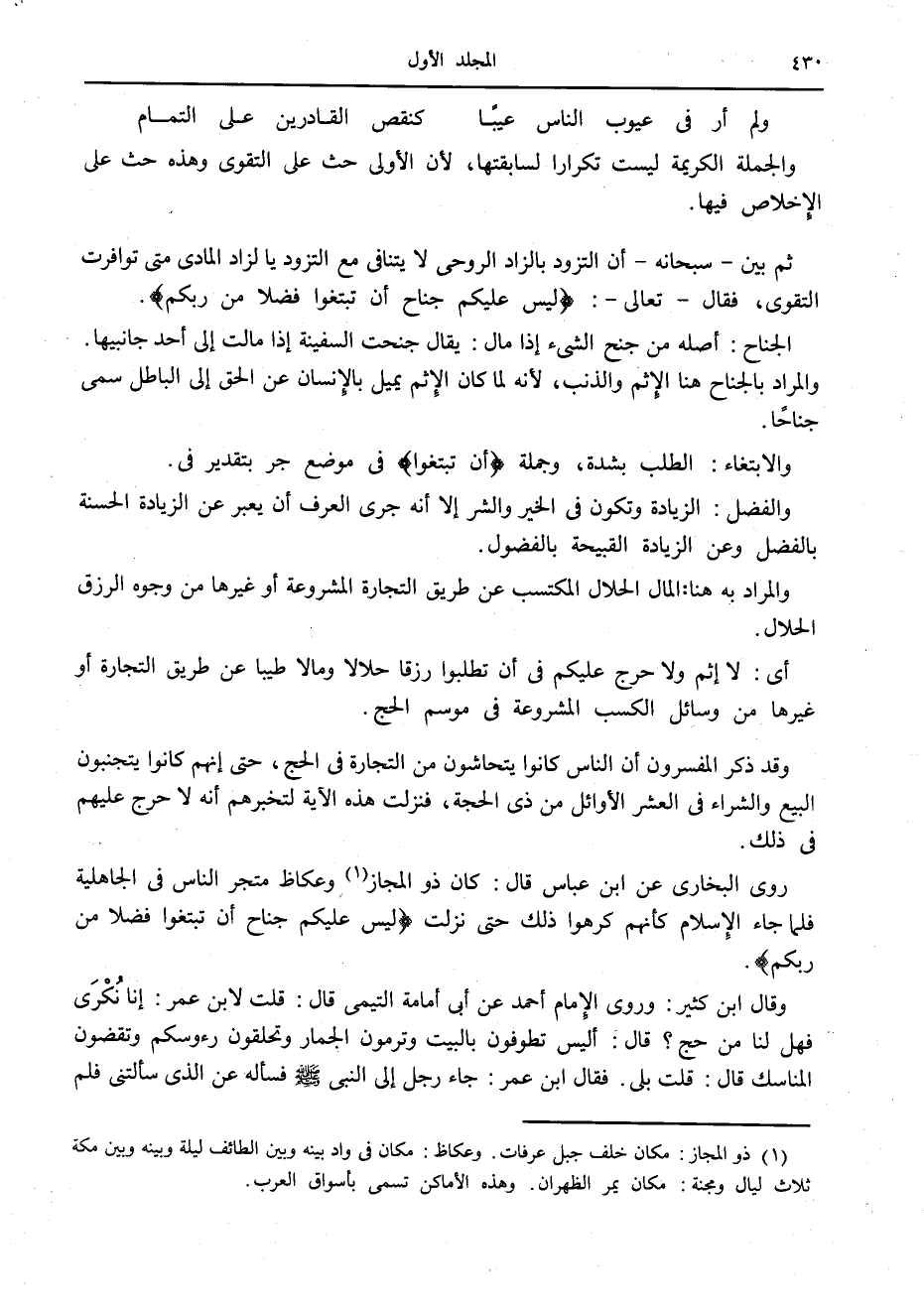 روى البخاري عن ابن عباس قال: كان ذو المجاز «1» وعكاظ متجر الناس في الجاهلية فلما جاء الإسلام كأنهم كرهوا ذلك حتى نزلت لَيْسَ عَلَيْكُمْ جُناحٌ أَنْ تَبْتَغُوا فَضْلًا مِنْ رَبِّكُمْ.
