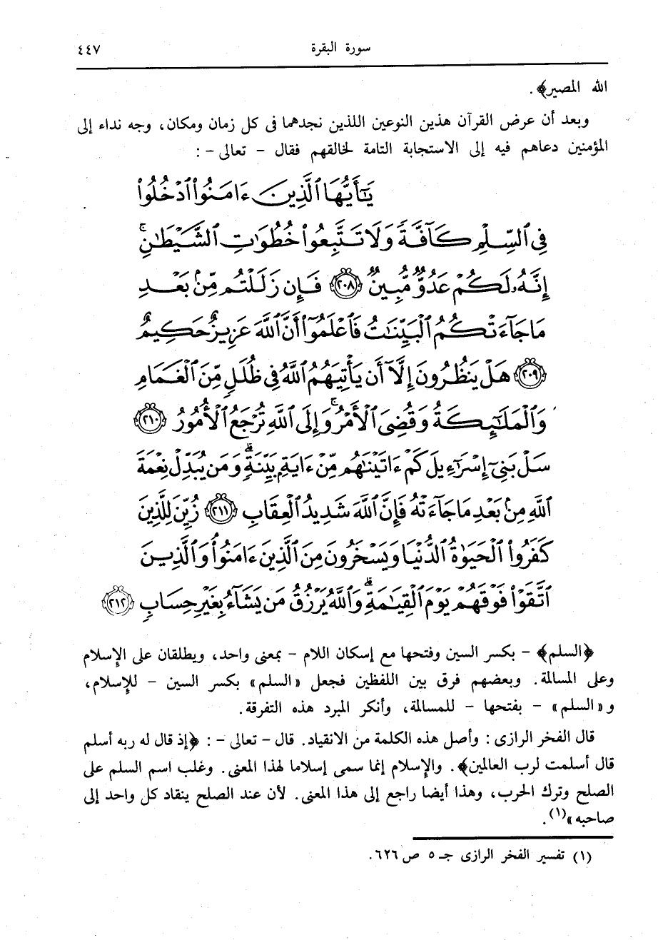 يا أَيُّهَا الَّذِينَ آمَنُوا ادْخُلُوا فِي السِّلْمِ كَافَّةً وَلا تَتَّبِعُوا خُطُواتِ الشَّيْطانِ إِنَّهُ لَكُمْ عَدُوٌّ مُبِينٌ (208) فَإِنْ زَلَلْتُمْ مِنْ بَعْدِ ما جاءَتْكُمُ الْبَيِّناتُ فَاعْلَمُوا أَنَّ اللَّهَ عَزِيزٌ حَكِيمٌ (209) هَلْ يَنْظُرُونَ إِلاَّ أَنْ يَأْتِيَهُمُ اللَّهُ فِي ظُلَلٍ مِنَ الْغَمامِ وَالْمَلائِكَةُ وَقُضِيَ الْأَمْرُ وَإِلَى اللَّهِ تُرْجَعُ الْأُمُورُ (210) سَلْ بَنِي إِسْرائِيلَ كَمْ آتَيْناهُمْ مِنْ آيَةٍ بَيِّنَةٍ وَمَنْ يُبَدِّلْ نِعْمَةَ اللَّهِ مِنْ بَعْدِ ما جاءَتْهُ فَإِنَّ اللَّهَ شَدِيدُ الْعِقابِ (211) زُيِّنَ لِلَّذِينَ كَفَرُوا الْحَياةُ الدُّنْيا وَيَسْخَرُونَ مِنَ الَّذِينَ آمَنُوا وَالَّذِينَ اتَّقَوْا فَوْقَهُمْ يَوْمَ الْقِيامَةِ وَاللَّهُ يَرْزُقُ مَنْ يَشاءُ بِغَيْرِ حِسابٍ (212)