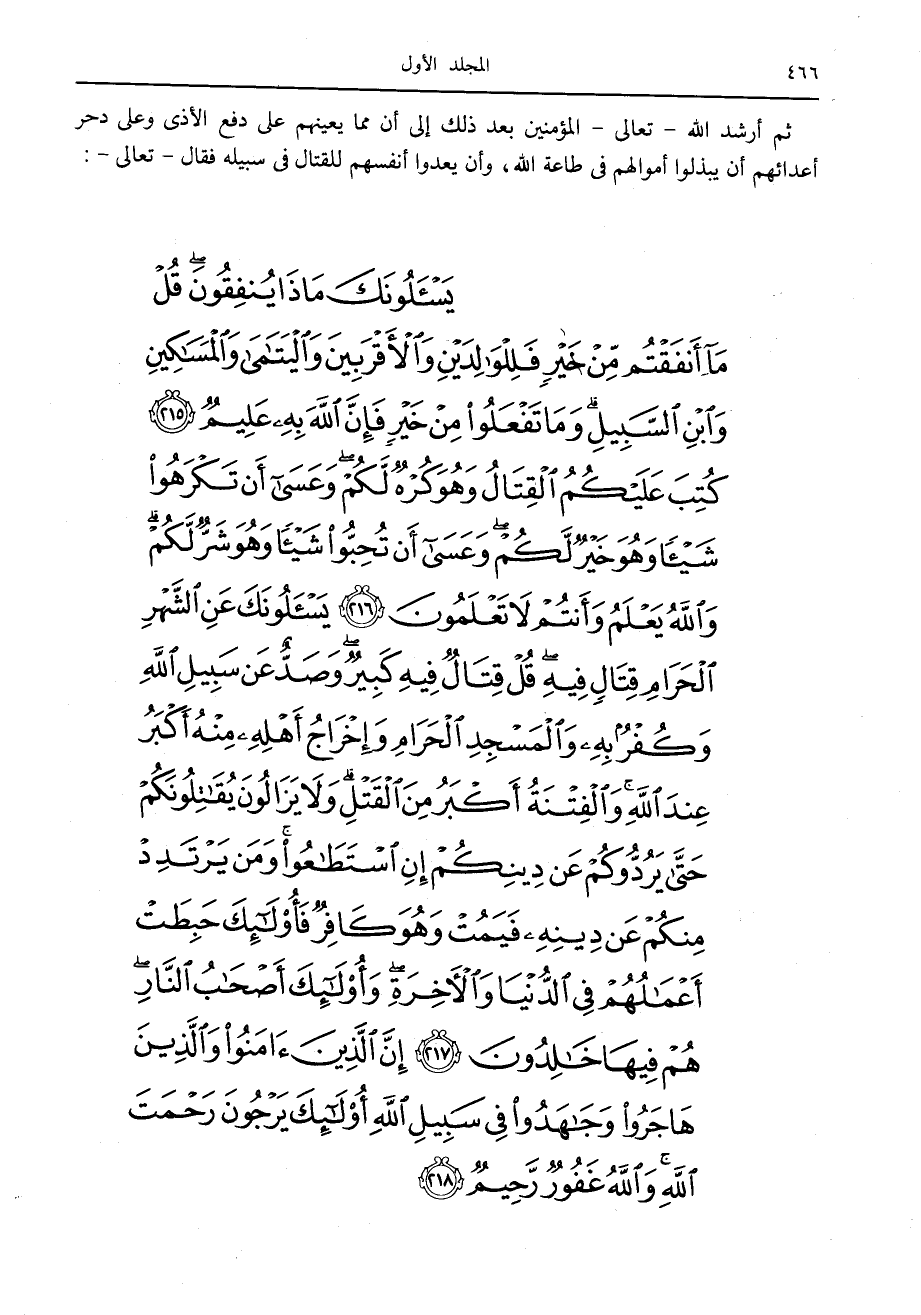 يَسْئَلُونَكَ ماذا يُنْفِقُونَ قُلْ ما أَنْفَقْتُمْ مِنْ خَيْرٍ فَلِلْوالِدَيْنِ وَالْأَقْرَبِينَ وَالْيَتامى وَالْمَساكِينِ وَابْنِ السَّبِيلِ وَما تَفْعَلُوا مِنْ خَيْرٍ فَإِنَّ اللَّهَ بِهِ عَلِيمٌ (215) كُتِبَ عَلَيْكُمُ الْقِتالُ وَهُوَ كُرْهٌ لَكُمْ وَعَسى أَنْ تَكْرَهُوا شَيْئاً وَهُوَ خَيْرٌ لَكُمْ وَعَسى أَنْ تُحِبُّوا شَيْئاً وَهُوَ شَرٌّ لَكُمْ وَاللَّهُ يَعْلَمُ وَأَنْتُمْ لا تَعْلَمُونَ (216) يَسْئَلُونَكَ عَنِ الشَّهْرِ الْحَرامِ قِتالٍ فِيهِ قُلْ قِتالٌ فِيهِ كَبِيرٌ وَصَدٌّ عَنْ سَبِيلِ اللَّهِ وَكُفْرٌ بِهِ وَالْمَسْجِدِ الْحَرامِ وَإِخْراجُ أَهْلِهِ مِنْهُ أَكْبَرُ عِنْدَ اللَّهِ وَالْفِتْنَةُ أَكْبَرُ مِنَ الْقَتْلِ وَلا يَزالُونَ يُقاتِلُونَكُمْ حَتَّى يَرُدُّوكُمْ عَنْ دِينِكُمْ إِنِ اسْتَطاعُوا وَمَنْ يَرْتَدِدْ مِنْكُمْ عَنْ دِينِهِ فَيَمُتْ وَهُوَ كافِرٌ فَأُولئِكَ حَبِطَتْ أَعْمالُهُمْ فِي الدُّنْيا وَالْآخِرَةِ وَأُولئِكَ أَصْحابُ النَّارِ هُمْ فِيها خالِدُونَ (217) إِنَّ الَّذِينَ آمَنُوا وَالَّذِينَ هاجَرُوا وَجاهَدُوا فِي سَبِيلِ اللَّهِ أُولئِكَ يَرْجُونَ رَحْمَتَ اللَّهِ وَاللَّهُ غَفُورٌ رَحِيمٌ (218)