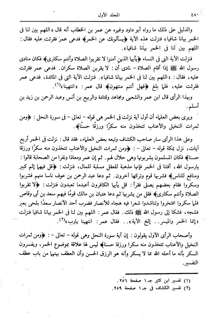 والدليل على ذلك ما رواه أبو داود وغيره عن عمر بن الخطاب أنه قال «اللهم بين لنا في الخمر بيانا شافيا» فنزلت هذه الآية يَسْئَلُونَكَ عَنِ الْخَمْرِ فدعى عمر فقرئت عليه فقال:
