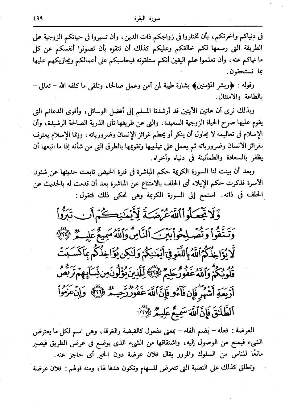 وَلا تَجْعَلُوا اللَّهَ عُرْضَةً لِأَيْمانِكُمْ أَنْ تَبَرُّوا وَتَتَّقُوا وَتُصْلِحُوا بَيْنَ النَّاسِ وَاللَّهُ سَمِيعٌ عَلِيمٌ (224) لا يُؤاخِذُكُمُ اللَّهُ بِاللَّغْوِ فِي أَيْمانِكُمْ وَلكِنْ يُؤاخِذُكُمْ بِما كَسَبَتْ قُلُوبُكُمْ وَاللَّهُ غَفُورٌ حَلِيمٌ (225) لِلَّذِينَ يُؤْلُونَ مِنْ نِسائِهِمْ تَرَبُّصُ أَرْبَعَةِ أَشْهُرٍ فَإِنْ فاؤُ فَإِنَّ اللَّهَ غَفُورٌ رَحِيمٌ (226) وَإِنْ عَزَمُوا الطَّلاقَ فَإِنَّ اللَّهَ سَمِيعٌ عَلِيمٌ (227)