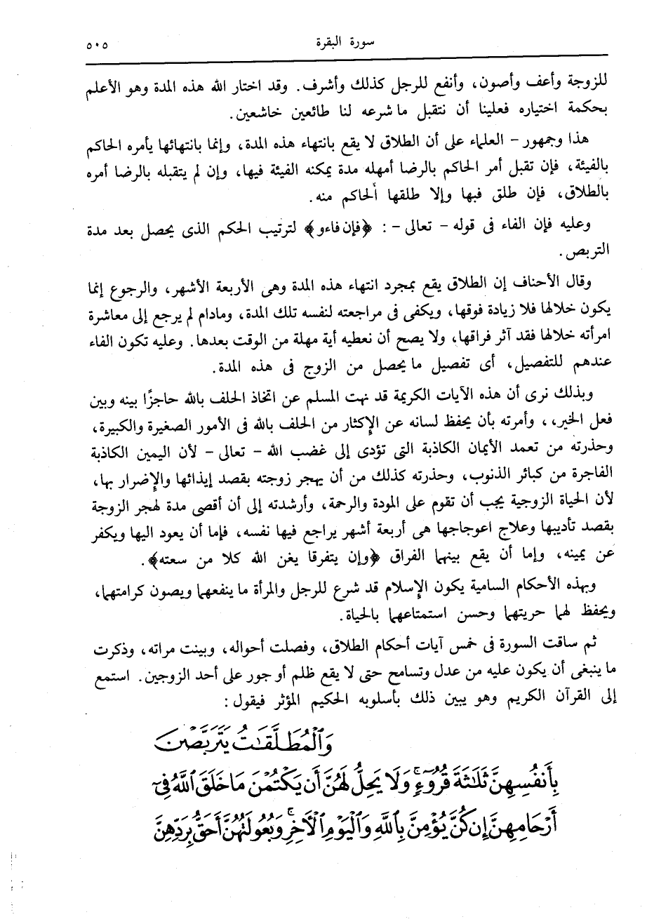 ثم ساقت السورة في خمس آيات أحكام الطلاق، وفصلت أحواله، وبينت مراته، وذكرت ما ينبغي أن يكون عليه من عدل وتسامح حتى لا يقع ظلم أو جور على أحد الزوجين. استمع إلى القرآن الكريم وهو يبين ذلك بأسلوبه الحكيم المؤثر فيقول: