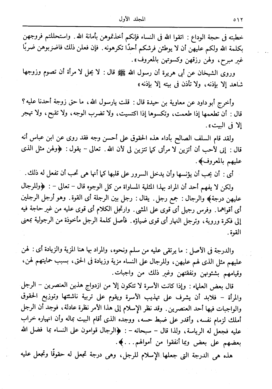 ولكن لا يفهم أحد أن المراد بهذا المثلية المساواة من كل الوجوه قال- تعالى-: وَلِلرِّجالِ عَلَيْهِنَّ دَرَجَةٌ والرجال: جمع رجل. يقال: رجل بين الرجلة أى القوة. وهو أرجل الرجلين أى أقواهما. وفرس رجيل أى قوى على المشي. وارتجل الكلام أى قوى عليه من غير حاجة فيه إلى فكرة وروية، وترجل النهار أى قوى ضياؤه. فأصل كلمة الرجل مأخوذة من الرجولية بمعنى القوة.