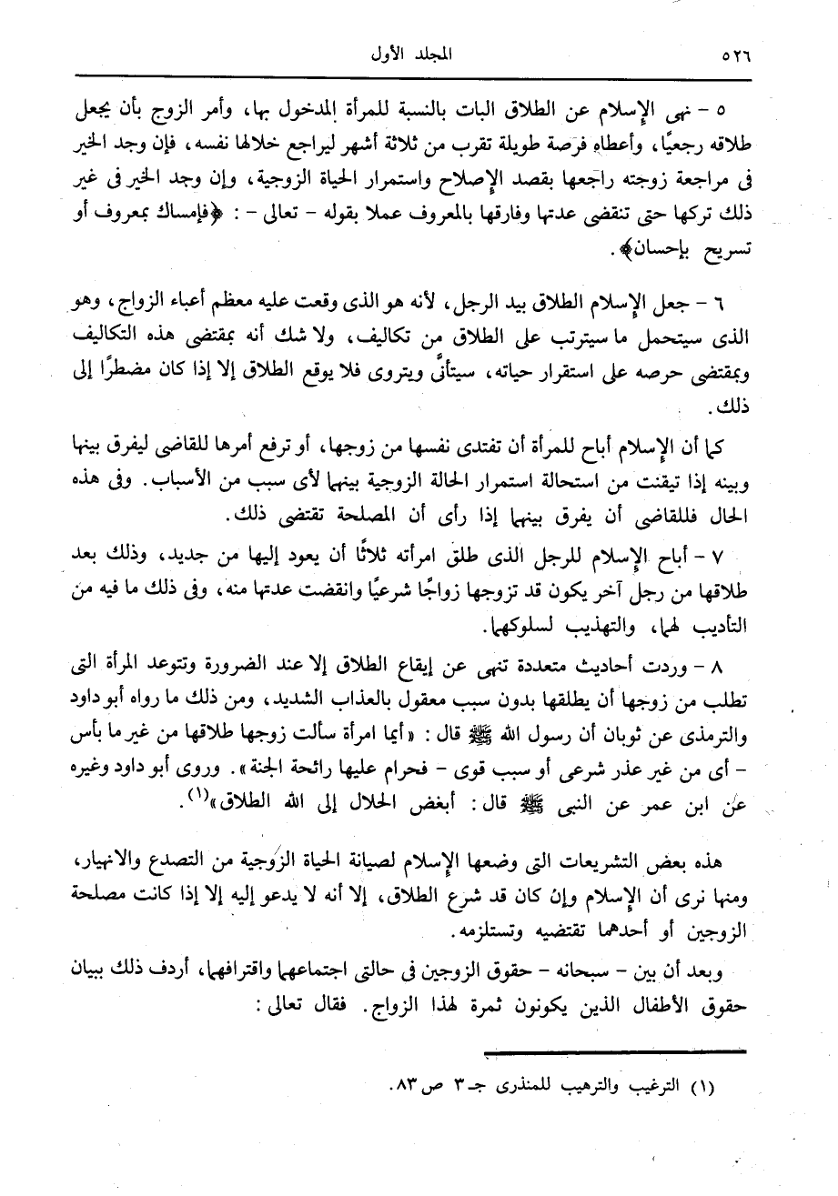 5- نهى الإسلام عن الطلاق البات بالنسبة للمرأة المدخول بها، وأمر الزوج بأن يجعل طلاقه رجعيا، وأعطاه فرصة طويلة تقرب من ثلاثة أشهر ليراجع خلالها نفسه، فإن وجد الخير في مراجعة زوجته راجعها بقصد الإصلاح واستمرار الحياة الزوجية، وإن وجد الخير في غير ذلك تركها حتى تنقضي عدتها وفارقها بالمعروف عملا بقوله- تعالى-: فَإِمْساكٌ بِمَعْرُوفٍ أَوْ تَسْرِيحٌ بِإِحْسانٍ.