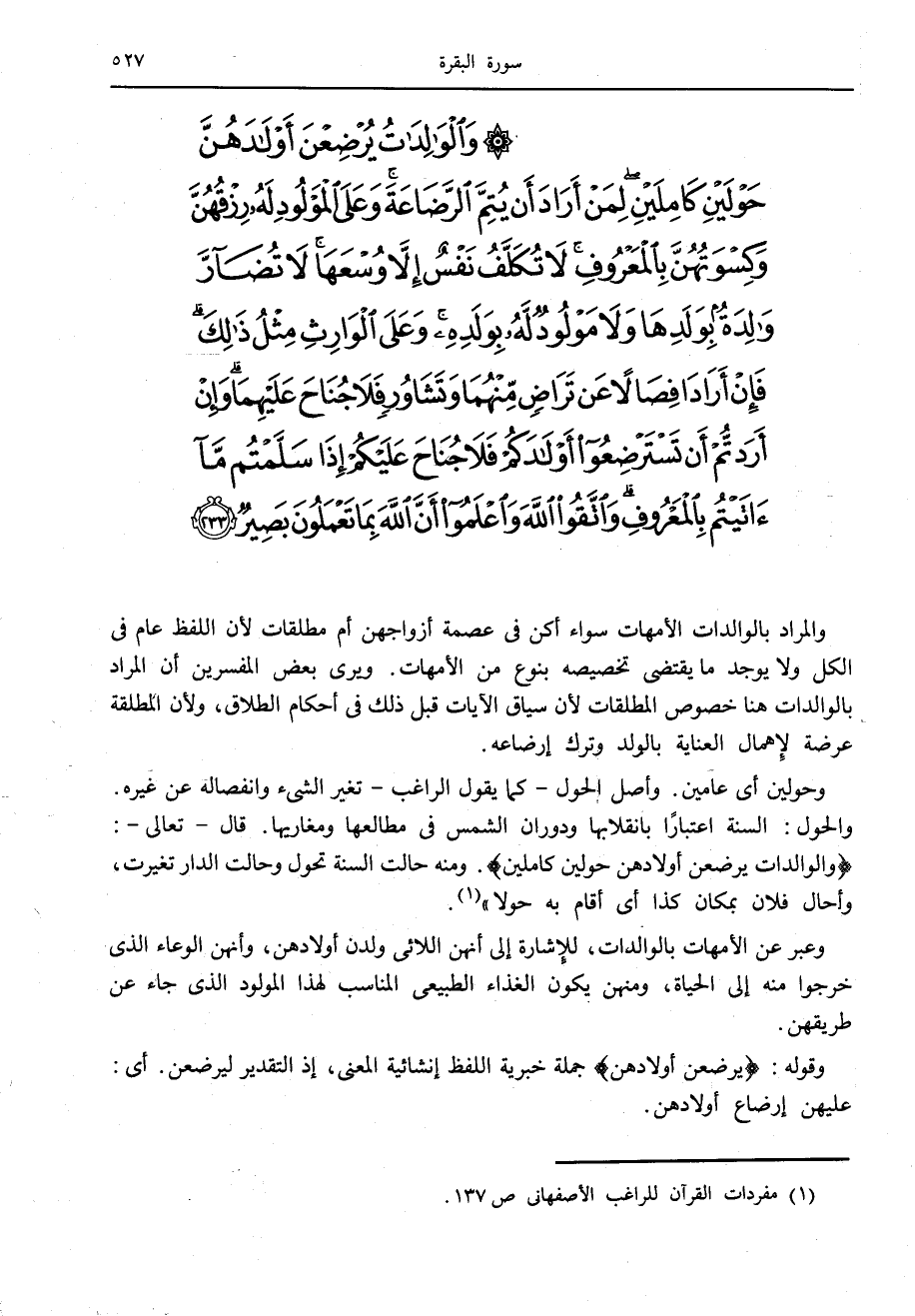 وَالْوالِداتُ يُرْضِعْنَ أَوْلادَهُنَّ حَوْلَيْنِ كامِلَيْنِ لِمَنْ أَرادَ أَنْ يُتِمَّ الرَّضاعَةَ وَعَلَى الْمَوْلُودِ لَهُ رِزْقُهُنَّ وَكِسْوَتُهُنَّ بِالْمَعْرُوفِ لا تُكَلَّفُ نَفْسٌ إِلاَّ وُسْعَها لا تُضَارَّ والِدَةٌ بِوَلَدِها وَلا مَوْلُودٌ لَهُ بِوَلَدِهِ وَعَلَى الْوارِثِ مِثْلُ ذلِكَ فَإِنْ أَرادا فِصالاً عَنْ تَراضٍ مِنْهُما وَتَشاوُرٍ فَلا جُناحَ عَلَيْهِما وَإِنْ أَرَدْتُمْ أَنْ تَسْتَرْضِعُوا أَوْلادَكُمْ فَلا جُناحَ عَلَيْكُمْ إِذا سَلَّمْتُمْ ما آتَيْتُمْ بِالْمَعْرُوفِ وَاتَّقُوا اللَّهَ وَاعْلَمُوا أَنَّ اللَّهَ بِما تَعْمَلُونَ بَصِيرٌ (233)
