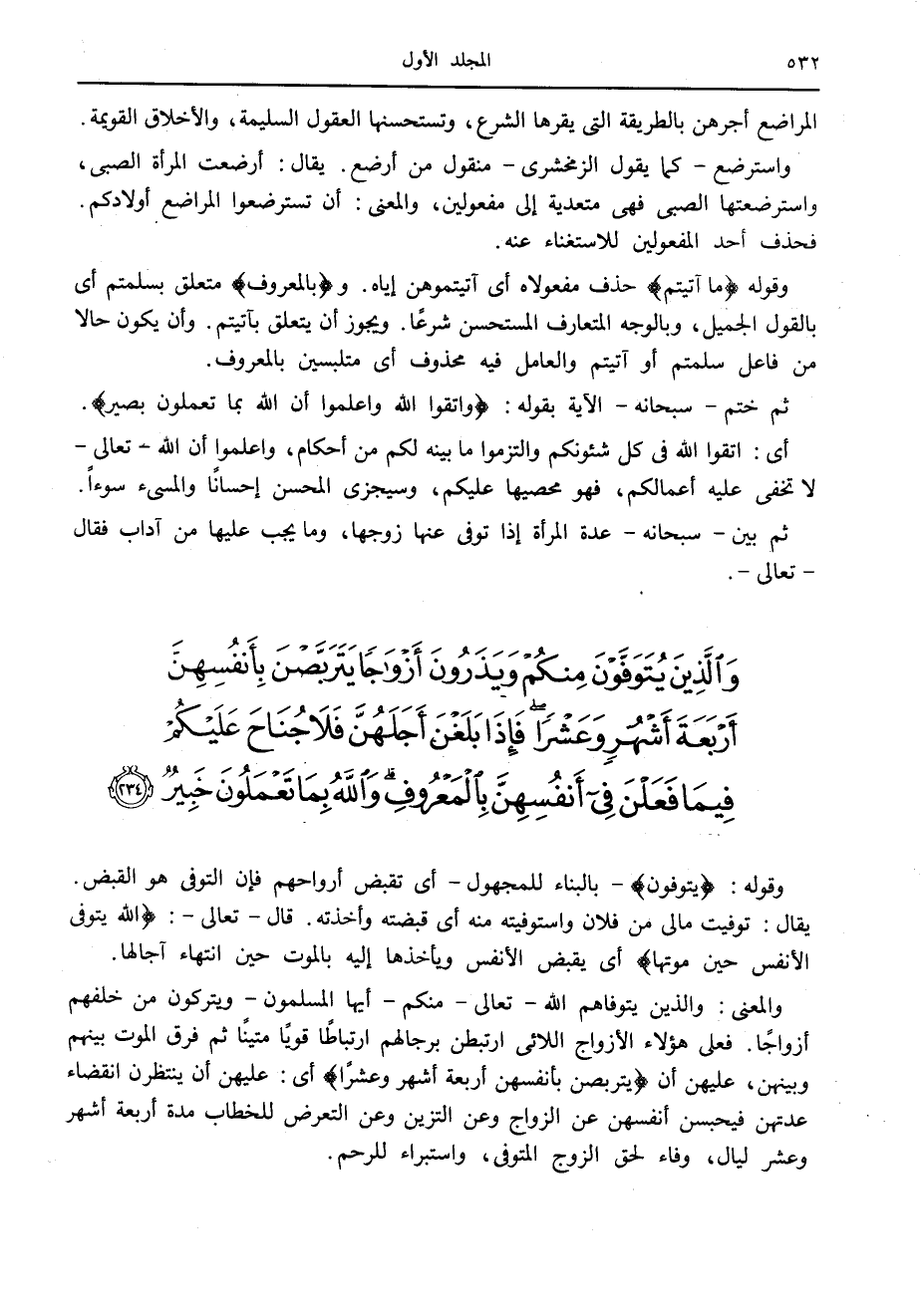 وَالَّذِينَ يُتَوَفَّوْنَ مِنْكُمْ وَيَذَرُونَ أَزْواجاً يَتَرَبَّصْنَ بِأَنْفُسِهِنَّ أَرْبَعَةَ أَشْهُرٍ وَعَشْراً فَإِذا بَلَغْنَ أَجَلَهُنَّ فَلا جُناحَ عَلَيْكُمْ فِيما فَعَلْنَ فِي أَنْفُسِهِنَّ بِالْمَعْرُوفِ وَاللَّهُ بِما تَعْمَلُونَ خَبِيرٌ (234)
