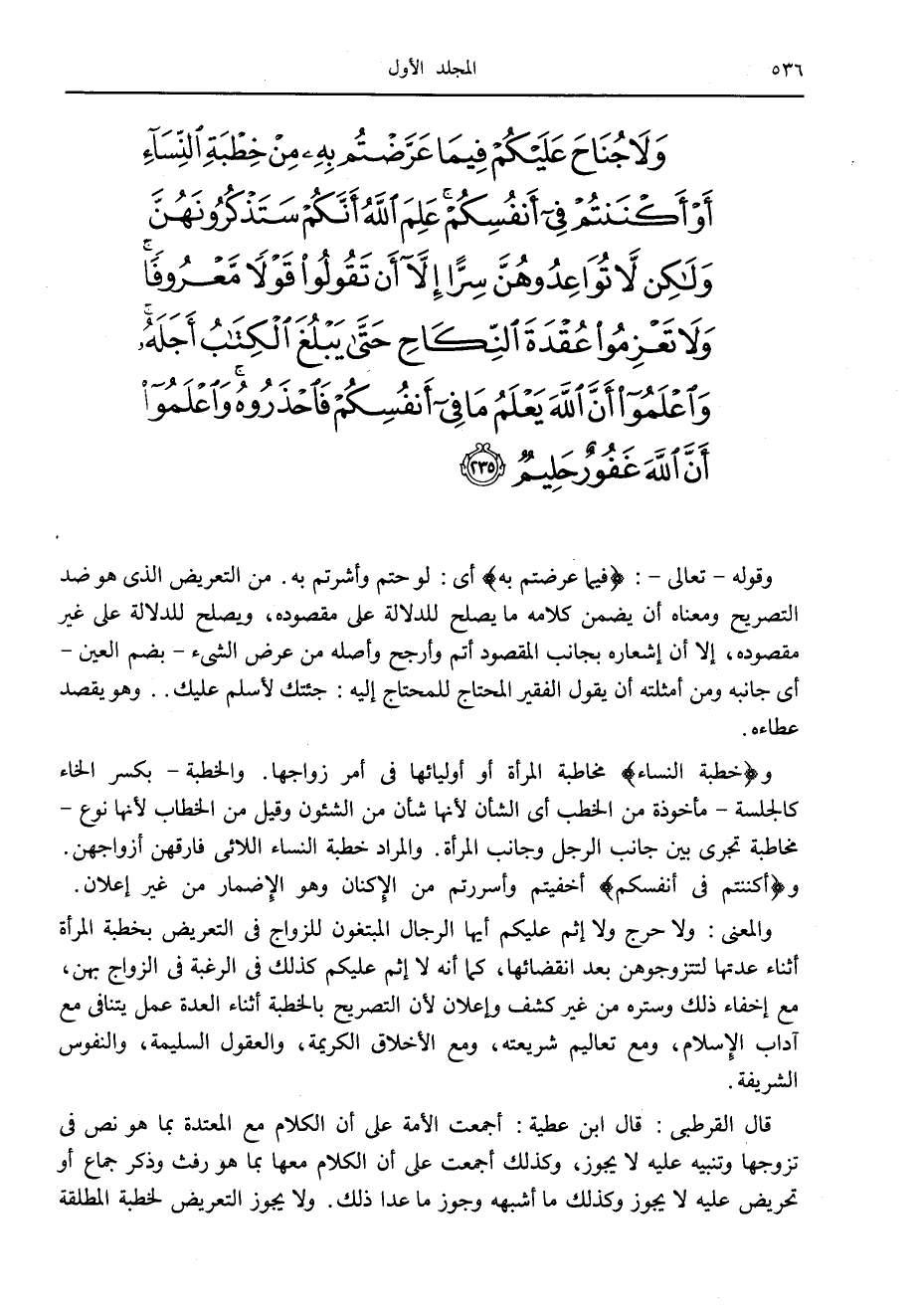وَلا جُناحَ عَلَيْكُمْ فِيما عَرَّضْتُمْ بِهِ مِنْ خِطْبَةِ النِّساءِ أَوْ أَكْنَنْتُمْ فِي أَنْفُسِكُمْ عَلِمَ اللَّهُ أَنَّكُمْ سَتَذْكُرُونَهُنَّ وَلكِنْ لا تُواعِدُوهُنَّ سِرًّا إِلاَّ أَنْ تَقُولُوا قَوْلاً مَعْرُوفاً وَلا تَعْزِمُوا عُقْدَةَ النِّكاحِ حَتَّى يَبْلُغَ الْكِتابُ أَجَلَهُ وَاعْلَمُوا أَنَّ اللَّهَ يَعْلَمُ ما فِي أَنْفُسِكُمْ فَاحْذَرُوهُ وَاعْلَمُوا أَنَّ اللَّهَ غَفُورٌ حَلِيمٌ (235)