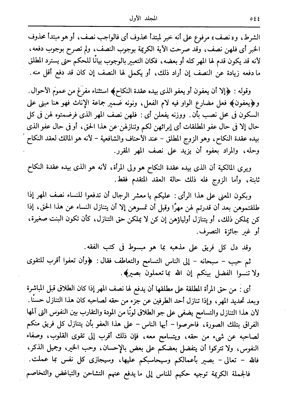 وبكون المعنى على هذا الرأى: عليكم يا معشر الرجال أن تدفعوا للنساء نصف المهر إذا طلقتموهن بعد أن قدرتم لهن مهرا وقبل أن تمسوهن إلا أن يتنازل النساء عن هذا الحق، إذا كن يملكن ذلك، أو يتنازل أولياؤهن إن كن لا يملكن حق التنازل، كأن تكون البنت صغيرة، أو غير جائزة التصرف.