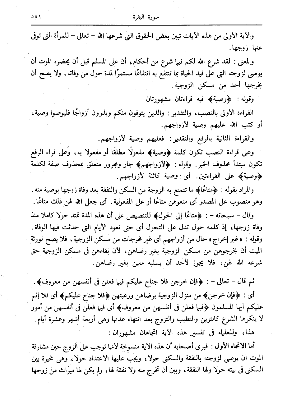 أما الاتجاه الأول: فيرى أصحابه أن هذه الآية منسوخة لأنها توجب على الزوج حين مشارفة الموت أن يوصى لزوجته بالنفقة والسكنى حولا، ويجب عليها الاعتداد حولا، وهي مخيرة بين السكنى في بيته حولا ولها النفقة، وبين أن تخرج منه ولا نفقة لها، ولم يكن لها ميراث من زوجها