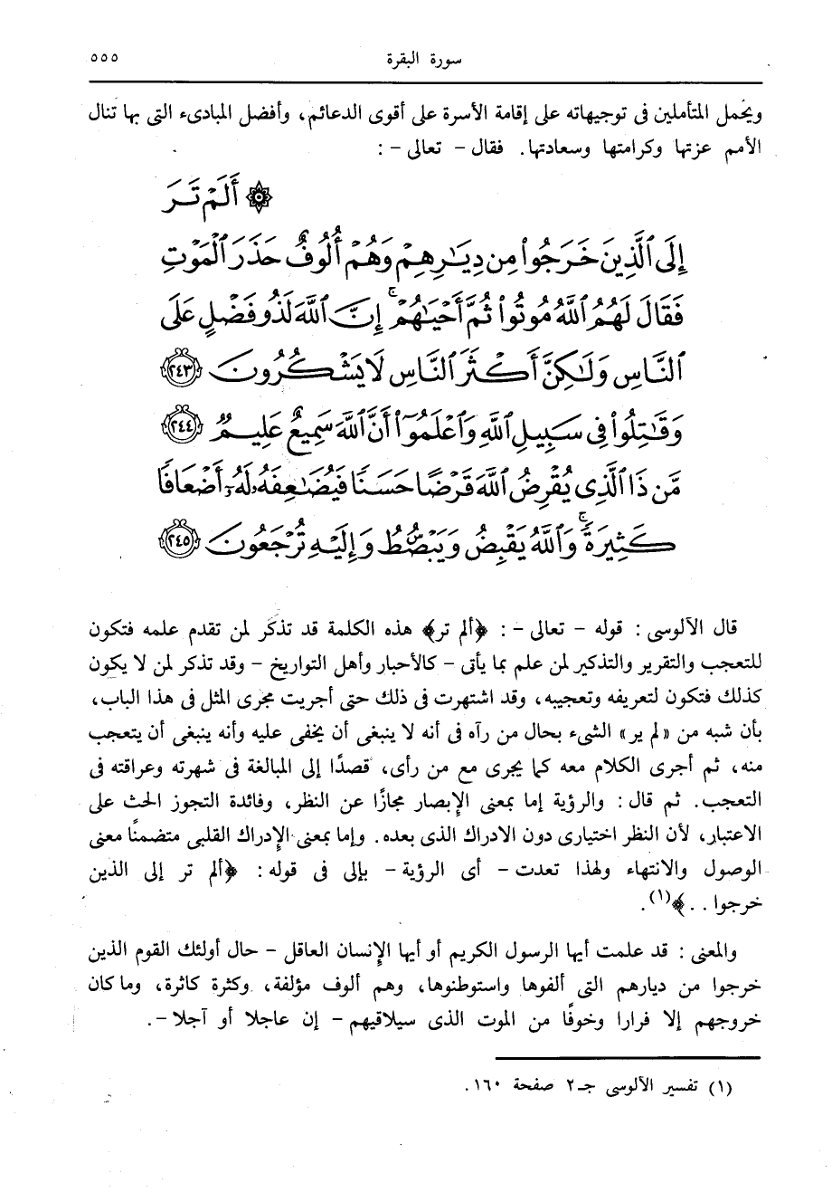 أَلَمْ تَرَ إِلَى الَّذِينَ خَرَجُوا مِنْ دِيارِهِمْ وَهُمْ أُلُوفٌ حَذَرَ الْمَوْتِ فَقالَ لَهُمُ اللَّهُ مُوتُوا ثُمَّ أَحْياهُمْ إِنَّ اللَّهَ لَذُو فَضْلٍ عَلَى النَّاسِ وَلكِنَّ أَكْثَرَ النَّاسِ لا يَشْكُرُونَ (243) وَقاتِلُوا فِي سَبِيلِ اللَّهِ وَاعْلَمُوا أَنَّ اللَّهَ سَمِيعٌ عَلِيمٌ (244) مَنْ ذَا الَّذِي يُقْرِضُ اللَّهَ قَرْضاً حَسَناً فَيُضاعِفَهُ لَهُ أَضْعافاً كَثِيرَةً وَاللَّهُ يَقْبِضُ وَيَبْصُطُ وَإِلَيْهِ تُرْجَعُونَ (245)