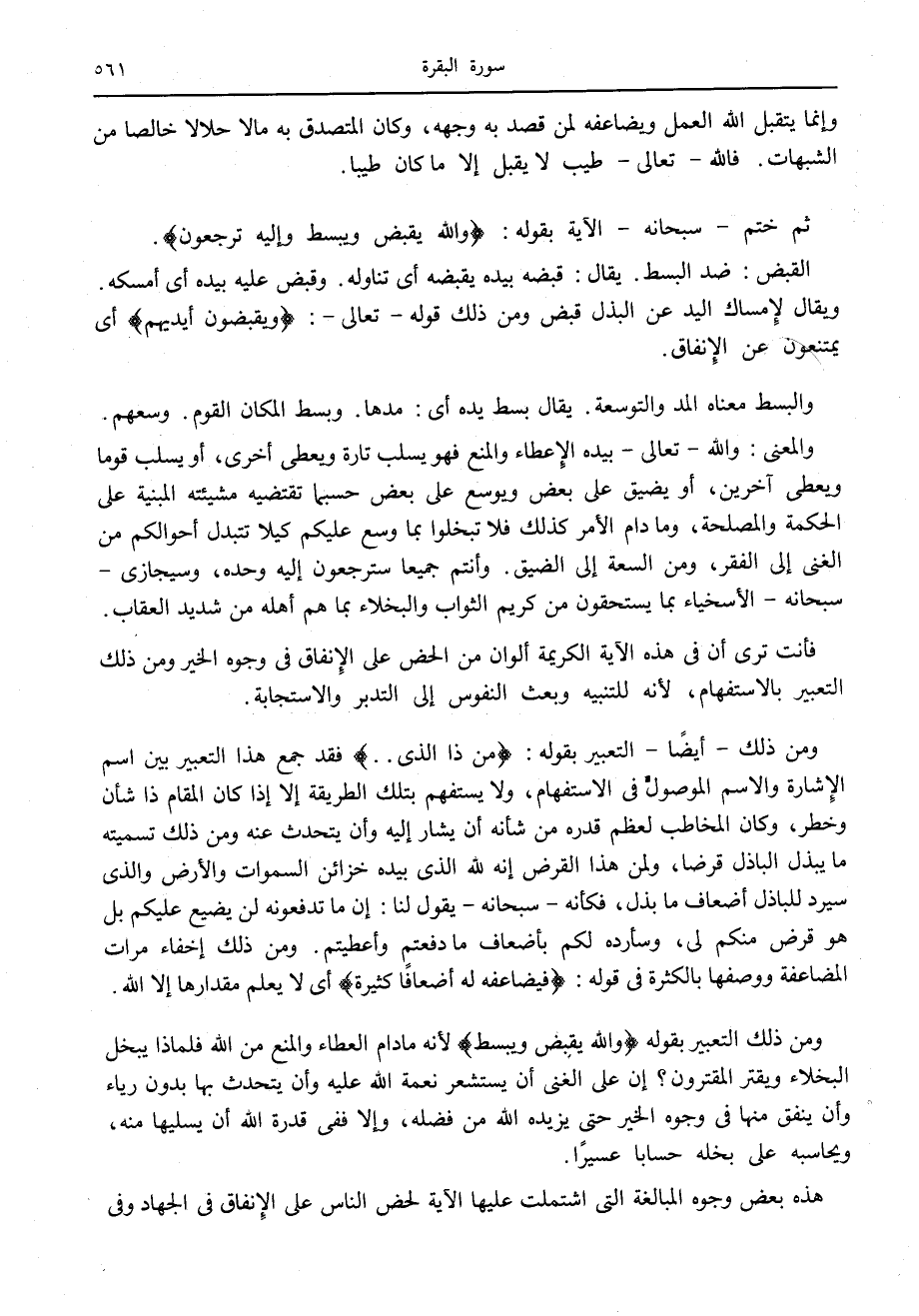 ومن ذلك- أيضا- التعبير بقوله: مَنْ ذَا الَّذِي.. فقد جمع هذا التعبير بين اسم الإشارة والاسم الموصول في الاستفهام، ولا يستفهم بتلك الطريقة إلا إذا كان المقام ذا شأن وخطر، وكان المخاطب لعظم قدره من شأنه أن يشار إليه وأن يتحدث عنه ومن ذلك تسميته ما يبذل الباذل قرضا، ولمن هذا القرض إنه لله الذي بيده خزائن السموات والأرض والذي سيرد للباذل أضعاف ما بذل، فكأنه- سبحانه- يقول لنا: إن ما تدفعونه لن يضيع عليكم بل هو قرض منكم لي، وسأرده لكم بأضعاف ما دفعتم وأعطيتم. ومن ذلك إخفاء مرات المضاعفة ووصفها بالكثرة في قوله: فَيُضاعِفَهُ لَهُ أَضْعافاً كَثِيرَةً أى لا يعلم مقدارها إلا الله.