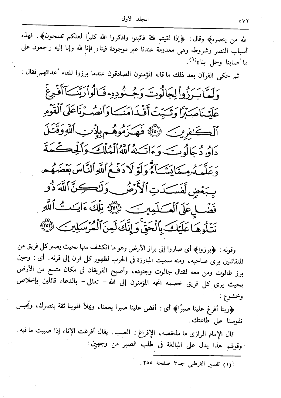 وقوله: بَرَزُوا أى صاروا إلى براز الأرض وهو ما انكشف منها بحيث يصير كل فريق من المتقاتلين يرى صاحبه، ومنه سميت المبارزة في الحرب لظهور كل قرن إلى قرنه. أى: وحين برز طالوت ومن معه لقتال جالوت وجنوده، وأصبح الفريقان في مكان متسع من الأرض بحيث يرى كل فريق خصمه اتجه المؤمنون إلى الله- تعالى- بالدعاء قائلين بإخلاص وخشوع:
