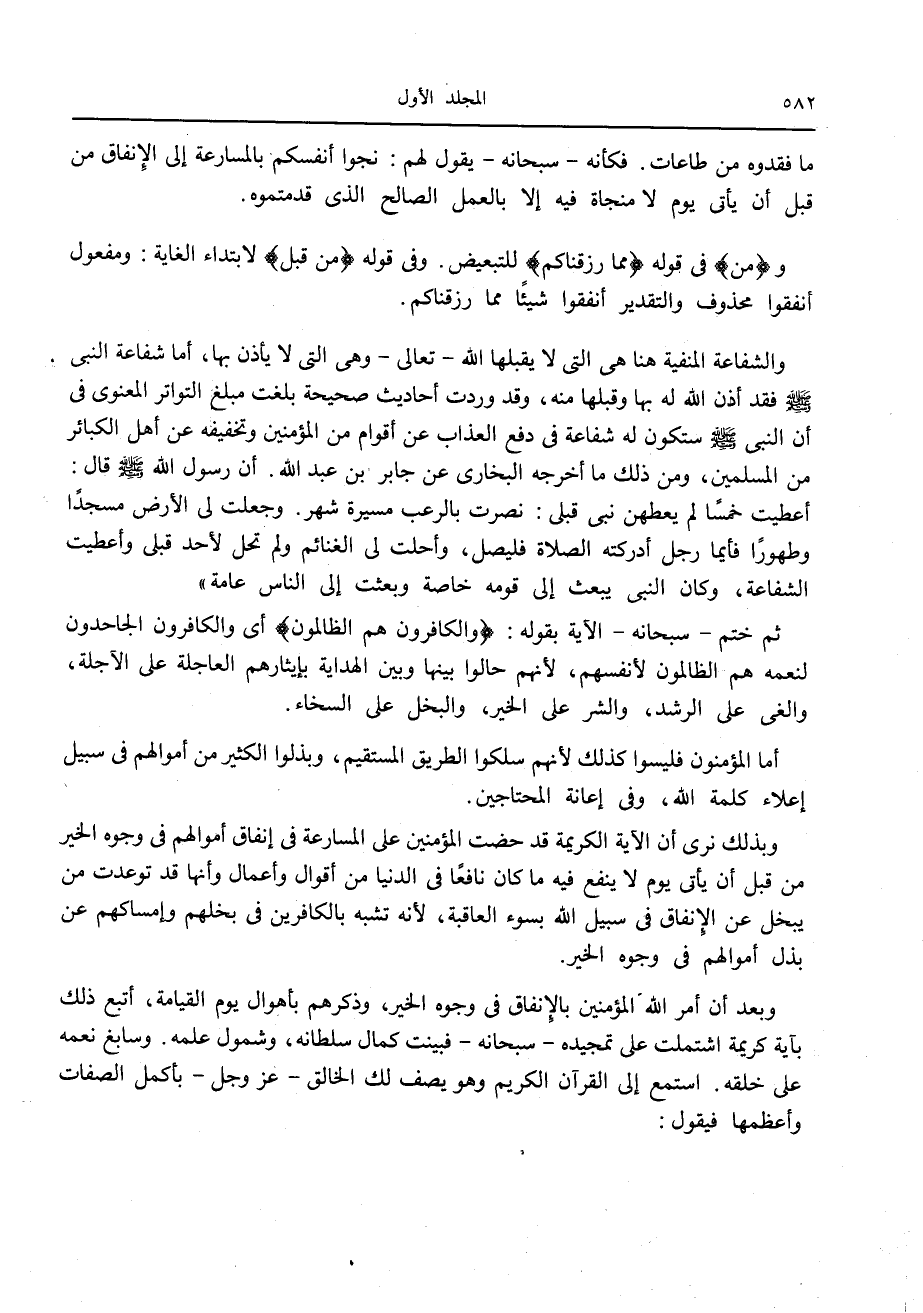 والشفاعة المنفية هنا هي التي لا يقبلها الله- تعالى- وهي التي لا يأذن بها، أما شفاعة النبي صلّى الله عليه وسلّم فقد أذن الله له بها وقبلها منه، وقد وردت أحاديث صحيحة بلغت مبلغ التواتر المعنوي في أن النبي صلّى الله عليه وسلّم ستكون له شفاعة في دفع العذاب عن أقوام من المؤمنين وتخفيفه عن أهل الكبائر من المسلمين، ومن ذلك ما أخرجه البخاري عن جابر بن عبد الله. أن رسول الله صلّى الله عليه وسلّم قال: