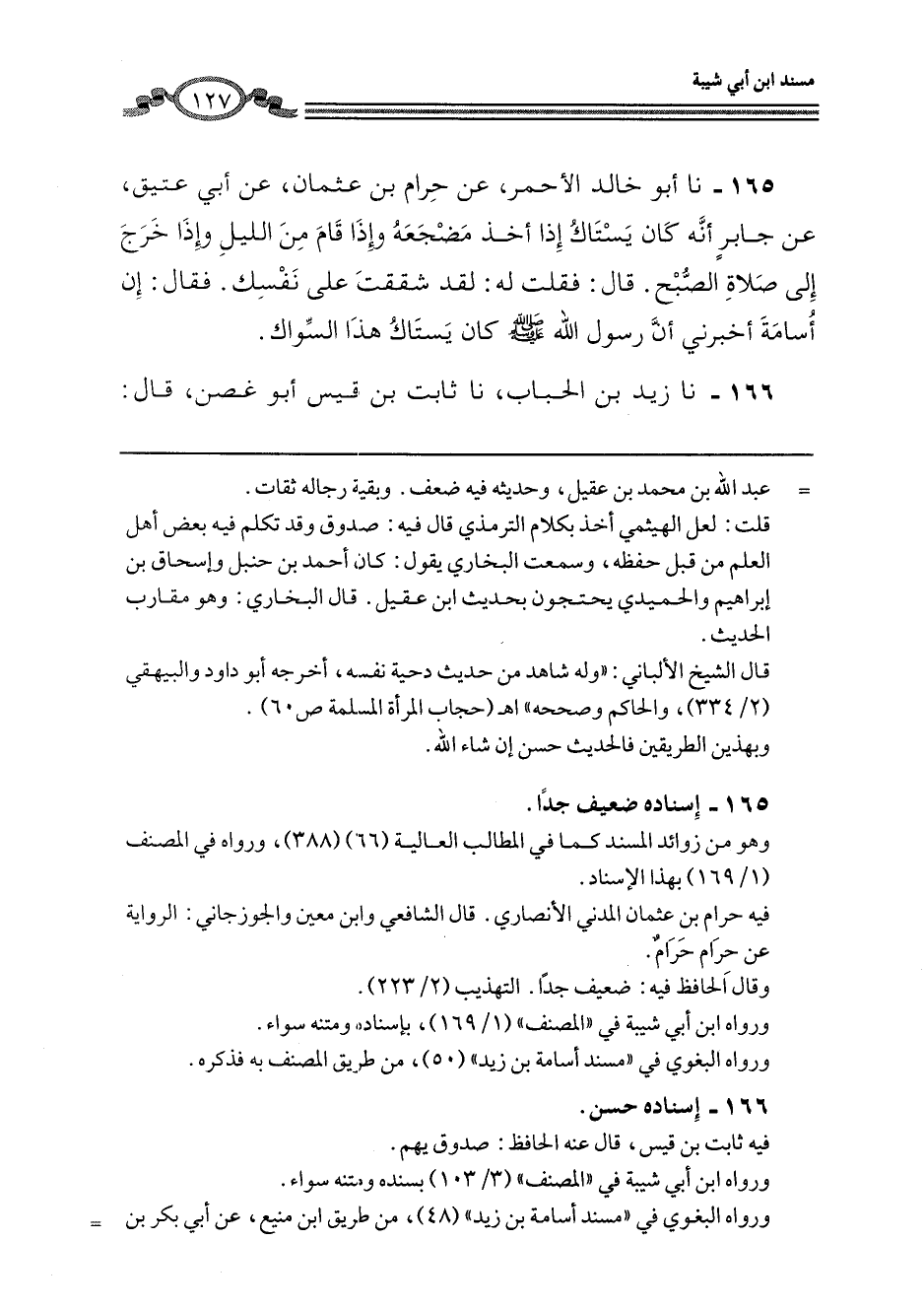 165 - نا أَبُو خَالِدٍ الْأَحْمَرُ، عَنْ حَرَامِ بْنِ عُثْمَانَ، عَنْ أَبِي عَتِيقٍ، عَنْ جَابِرٍ، أَنَّهُ كَانَ يَسْتَاكُ إِذَا أَخَذَ مَضْجَعَهُ، وَإِذَا قَامَ مِنَ اللَّيْلِ، وَإِذَا خَرَجَ إِلَى صَلَاةِ الصُّبْحِ، قَالَ: فَقُلْتُ لَهُ: لَقَدْ شَقَقْتُ عَلَى نَفْسِكَ، فَقَالَ: إِنَّ أُسَامَةَ أَخْبَرَنِي أَنَّ رَسُولَ اللَّهِ صَلَّى اللهُ عَلَيْهِ وَسَلَّمَ كَانَ «§يَسْتَاكُ هَذَا السِّوَاكَ»