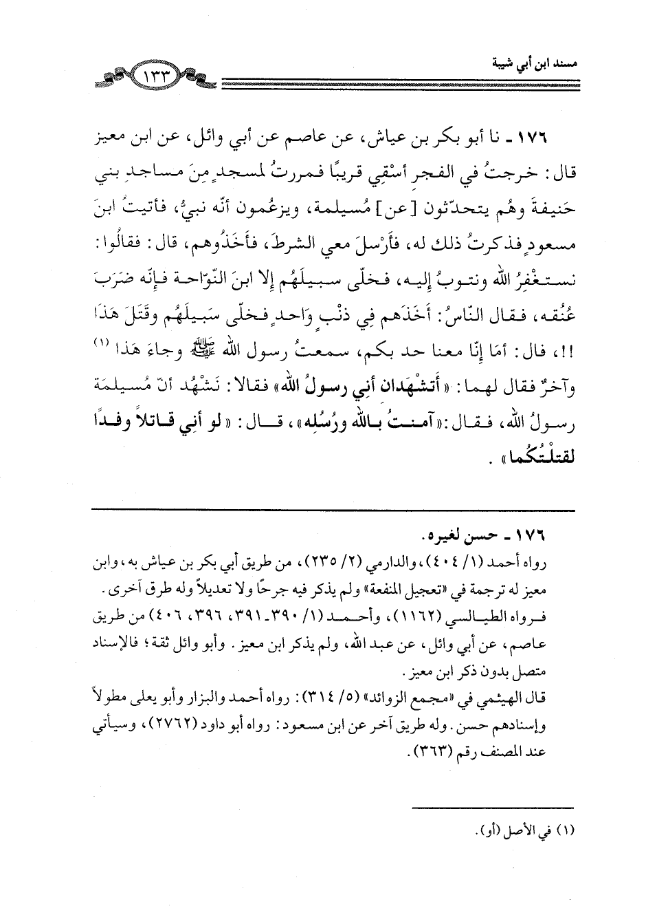 176 - نا أَبُو بَكْرِ بْنُ عَيَّاشٍ، عَنْ عَاصِمٍ، عَنْ أَبِي وَائِلٍ، عَنِ ابْنِ مُعَيْزٍ، قَالَ: خَرَجْتُ فِي الْفَجْرِ أَسْقِي قَرِيبًا، فَمَرَرْتُ لِمَسْجِدٍ مِنْ مَسَاجِدِ بَنِي حَنِيفَةَ وَهُمْ يَتَحَدَّثُونَ عَنْ مُسَيْلِمَةَ، وَيَزْعُمُونَ أَنَّهُ نَبِيٌّ، فَأَتَيْتُ ابْنَ مَسْعُودٍ فَذَكَرْتُ ذَلِكَ لَهُ، فَأَرْسَلَ مَعِي الشُّرَطَ فَأَخَذُوهُمْ، قَالَ: فَقَالُوا: نَسْتَغْفِرُ اللَّهَ وَنَتُوبُ إِلَيْهِ، فَخَلَّى سَبِيلَهُمْ إِلَّا ابْنَ النَّوَّاحَةِ فَإِنَّهُ ضَرَبَ عُنُقَهُ، فَقَالَ النَّاسُ: أَخَذَهُمْ فِي ذَنْبٍ وَاحِدٍ فَخَلَّى سَبِيلَهُمْ وَقَتَلَ هَذَا قَالَ: أَمَّا إِنَّا مَعَنَا حَدٌّ بِكُمْ، سَمِعْتُ رَسُولَ اللَّهِ صَلَّى اللهُ عَلَيْهِ وَسَلَّمَ وَجَاءَ هَذَا وَآخَرُ، فَقَالَ لَهُمَا: «أَتَشْهَدَانِ أَنِّي رَسُولُ اللَّهِ» ، فَقَالَا: نَشْهَدُ أَنَّ مُسَيْلِمَةَ رَسُولُ اللَّهِ، فَقَالَ: «آمَنْتُ بِاللَّهِ وَرُسُلِهِ» ، قَالَ: «§لَوْ أَنِّي قَاتِلٌ وَفْدًا لَقَتَلْتُكُمَا»