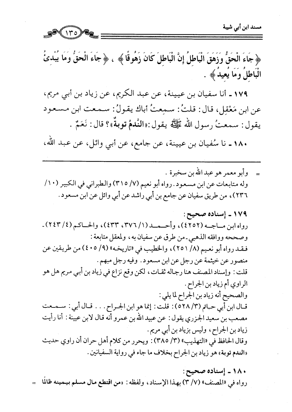 179 - أَنَا سُفْيَانُ بْنُ عُيَيْنَةَ، عَنْ عَبْدِ الْكَرِيمِ، عَنْ زِيَادِ بْنِ أَبِي مَرْيَمَ، عَنِ ابْنِ مَعْقِلٍ، قَالَ: قُلْتُ: سَمِعْتُ أَبَاكَ، يَقُولُ: سَمِعْتُ ابْنَ مَسْعُودٍ، يَقُولُ: سَمِعْتُ رَسُولَ اللَّهِ صَلَّى اللهُ عَلَيْهِ وَسَلَّمَ يَقُولُ: «§النَّدَمُ تَوْبَةٌ؟» قَالَ: نَعَمْ
