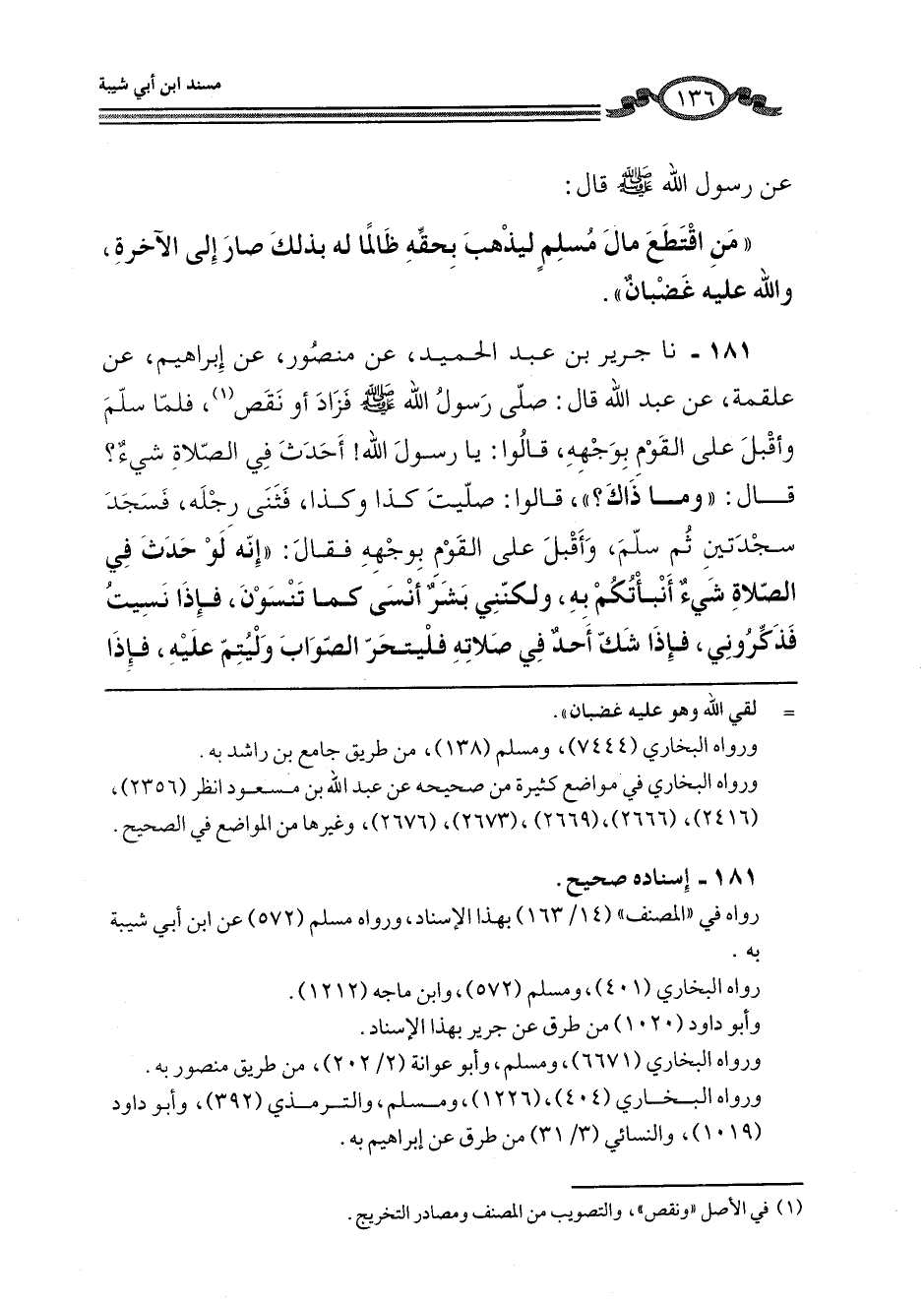 181 - نا جَرِيرُ بْنُ عَبْدِ الْحَمِيدِ، عَنْ مَنْصُورٍ، عَنْ إِبْرَاهِيمَ، عَنْ عَلْقَمَةَ، عَنْ عَبْدِ اللَّهِ، قَالَ: صَلَّى رَسُولُ اللَّهِ صَلَّى اللهُ عَلَيْهِ وَسَلَّمَ فَزَادَ أَوْ نَقَصَ، فَلَمَّا سَلَّمَ وَأَقْبَلَ عَلَى الْقَوْمِ بِوَجْهِهِ، قَالُوا: يَا رَسُولَ اللَّهِ أَحَدَثَ فِي الصَّلَاةِ شَيْءٌ؟، قَالَ: «وَمَا ذَاكَ؟» قَالُوا: صَلَّيْتُ كَذَا وَكَذَا، فَثَنَى رِجْلَهُ، فَسَجَدَ سَجْدَتَيْنِ ثُمَّ سَلَّمَ، وَأَقْبَلَ عَلَى الْقَوْمِ بِوَجْهِهِ، فَقَالَ: «إِنَّهُ §لَوْ حَدَّثَ فِي الصَّلَاةِ شَيْءٌ أَنْبَأْتُكُمْ بِهِ، وَلَكِنَّنِي بَشَرٌ أَنْسَى كَمَا تَنْسُونَ، فَإِذَا نَسِيتُ فَذَكِّرُونِي، فَإِذَا شَكَّ أَحَدٌ فِي صَلَاتِهِ فَلْيَتَحَرَّ الصَّوَابَ وَلْيُتِمَّ عَلَيْهِ، فَإِذَا -[137]- سَلَّمَ سَجَدَ سَجْدَتَيْنِ»