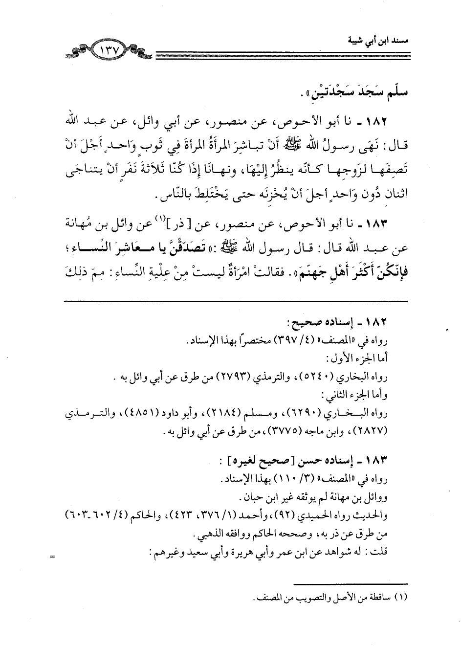 183 - نا أَبُو الْأَحْوَصِ، عَنْ مَنْصُورٍ، عَنْ ذَرٍّ، عَنْ وَائِلِ بْنِ مَهَانَةَ، عَنْ عَبْدِ اللَّهِ، قَالَ: قَالَ رَسُولُ اللَّهِ صَلَّى اللهُ عَلَيْهِ وَسَلَّمَ: «§تَصَدَّقْنَ يَا مَعْشَرَ النِّسَاءِ، فَإِنَّكُنَّ أَكْثَرُ أَهْلِ جَهَنَّمَ» ، فَقَالَتِ امْرَأَةٌ لَيْسَتْ مِنْ عِلْيَةِ النِّسَاءِ: مِمَّ ذَلِكَ -[138]- يَا رَسُولَ اللَّهِ؟ قَالَ: «لِأَنَّكُنَّ تُكْثِرْنَ اللَّعْنَ، وَتَكْفُرْنَ الْعَشِيرَ»