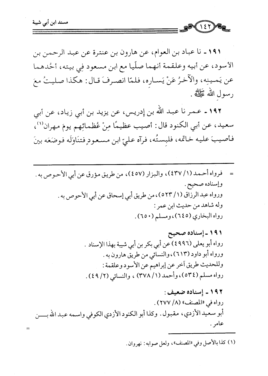 192 - نا عَبْدُ اللَّهِ بْنُ إِدْرِيسَ، عَنْ يَزِيدَ بْنِ أَبِي زِيَادٍ، عَنْ أَبِي سَعِيدٍ، عَنْ أَبِي الْكَنُودِ، قَالَ: أُصِيبَ عَظِيمٌ مِنْ عُظَمَائِهِمْ يَوْمَ مِهْرَانَ، فَأُصِيبَ عَلَيْهِ خَاتَمُهُ، فَلَبِسْتُهُ، فَرَآهُ عَلَيَّ ابْنُ مَسْعُودٍ فَتَنَاوَلَهُ فَوَضَعَهُ بَيْنَ ضِرْسَيْنِ مِنْ أَضْرَاسِهِ، ثُمَّ قَالَ: إِنَّ رَسُولَ اللَّهِ صَلَّى اللهُ عَلَيْهِ وَسَلَّمَ «§نَهَانَا عَنْ خَاتَمِ الذَّهَبِ»