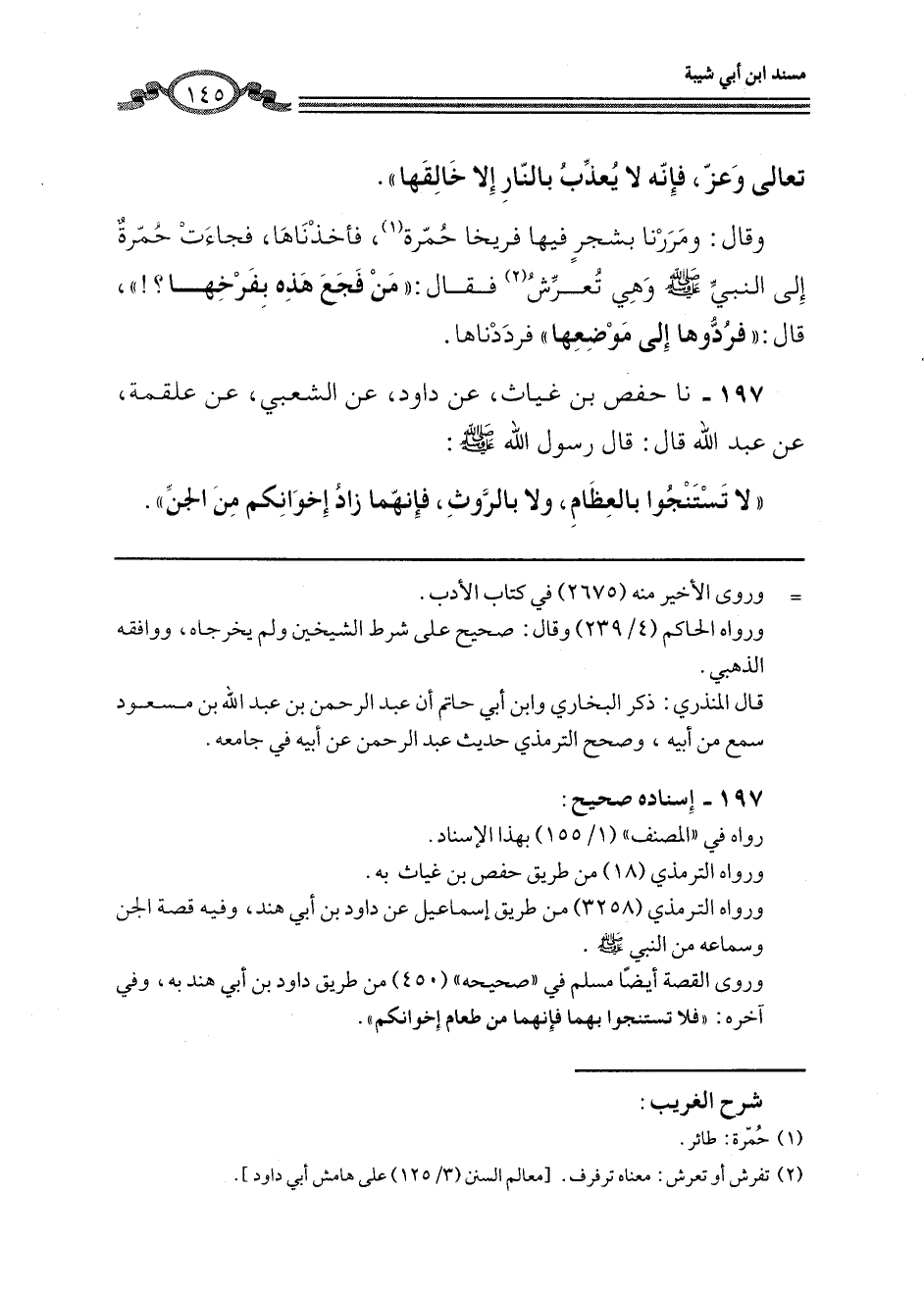 197 - نا حَفْصُ بْنُ غِيَاثٍ، عَنْ دَاوُدَ، عَنِ الشَّعْبِيِّ، عَنْ عَلْقَمَةَ، عَنْ عَبْدِ اللَّهِ، قَالَ: قَالَ رَسُولُ اللَّهِ صَلَّى اللهُ عَلَيْهِ وَسَلَّمَ: «§لَا تَسْتَنْجُوا بِالْعِظَامِ، وَلَا بِالرَّوْثِ، فَإِنَّهُمَا زَادُ إِخْوَانِكُمْ مِنَ الْجِنِّ»