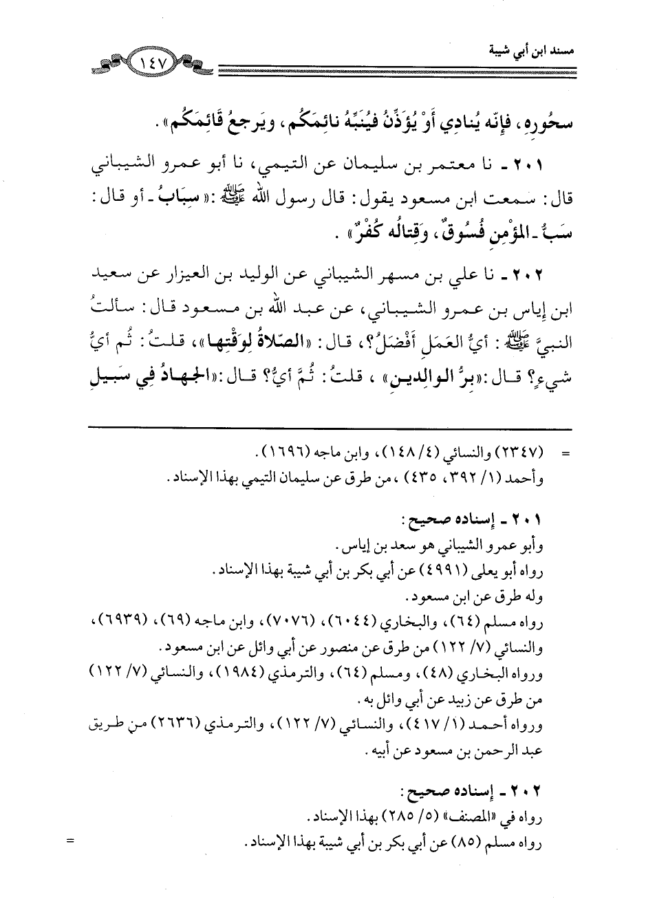 201 - نا مُعْتَمِرُ بْنُ سُلَيْمَانَ، عَنِ التَّيْمِيِّ، نَا أَبُو عَمْرٍو الشَّيْبَانِيُّ، قَالَ: سَمِعْتُ ابْنَ مَسْعُودٍ، يَقُولُ: قَالَ رَسُولُ اللَّهِ صَلَّى اللهُ عَلَيْهِ وَسَلَّمَ: " سِبَابُ - أَوْ قَالَ: §سَبُّ - الْمُؤْمِنِ فُسُوقٌ، وَقِتَالُهُ كُفْرٌ "