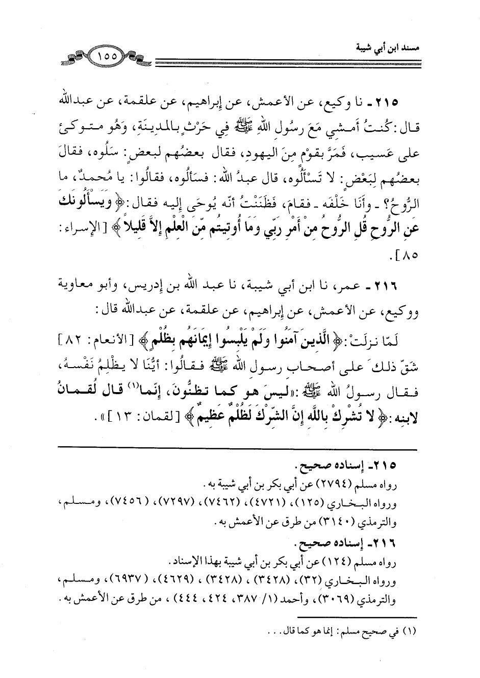 216 - عُمَرُ، نا ابْنُ أَبِي شَيْبَةَ، نا عَبْدُ اللَّهِ بْنُ إِدْرِيسَ، وَأَبُو مُعَاوِيَةَ، وَوَكِيعٌ، عَنِ الْأَعْمَشِ، عَنْ إِبْرَاهِيمَ، عَنْ عَلْقَمَةَ، عَنْ عَبْدِ اللَّهِ، قَالَ: لَمَّا نَزَلَتْ: {§الَّذِينَ آمَنُوا وَلَمْ يَلْبِسُوا} [الأنعام: 82] إِيمَانَهُمْ بِظُلْمٍ شَقَّ ذَلِكَ عَلَى أَصْحَابِ رَسُولِ اللَّهِ صَلَّى اللهُ عَلَيْهِ وَسَلَّمَ فَقَالُوا: أَيُّنَا لَا يَظْلِمُ نَفْسَهُ، فَقَالَ رَسُولُ اللَّهِ صَلَّى اللهُ عَلَيْهِ وَسَلَّمَ: " لَيْسَ هُوَ كَمَا تَظُنُّونَ، إِنَّمَا قَالَ لُقْمَانُ لِابْنِهِ: {لَا تُشْرِكْ بِاللَّهِ إِنَّ الشِّرْكَ} [لقمان: 13] لَظُلْمٌ عَظِيمٌ "