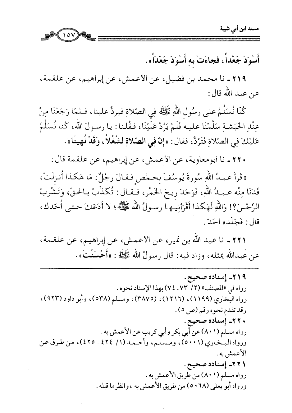 219 - نا مُحَمَّدُ بْنُ فُضَيْلٍ، عَنِ الْأَعْمَشِ، عَنْ إِبْرَاهِيمَ، عَنْ عَلْقَمَةَ، عَنْ عَبْدِ اللَّهِ، قَالَ: كُنَّا نُسَلِّمُ عَلَى رَسُولِ اللَّهِ صَلَّى اللهُ عَلَيْهِ وَسَلَّمَ فِي الصَّلَاةِ فَيَرُدُّ عَلَيْنَا، فَلَمَّا رَجَعْنَا مِنْ عِنْدِ الْحَبَشَةِ سَلَّمْنَا عَلَيْهِ فَلَمْ يَرُدَّ عَلَيْنَا، فَقُلْنَا: يَا رَسُولَ اللَّهِ، كُنَّا نُسَلِّمُ عَلَيْكَ فِي الصَّلَاةِ فَتُرَدُّ، فَقَالَ: «إِنَّ §فِي الصَّلَاةِ لَشُغُلًا، وَقَدْ نُهِينَا»