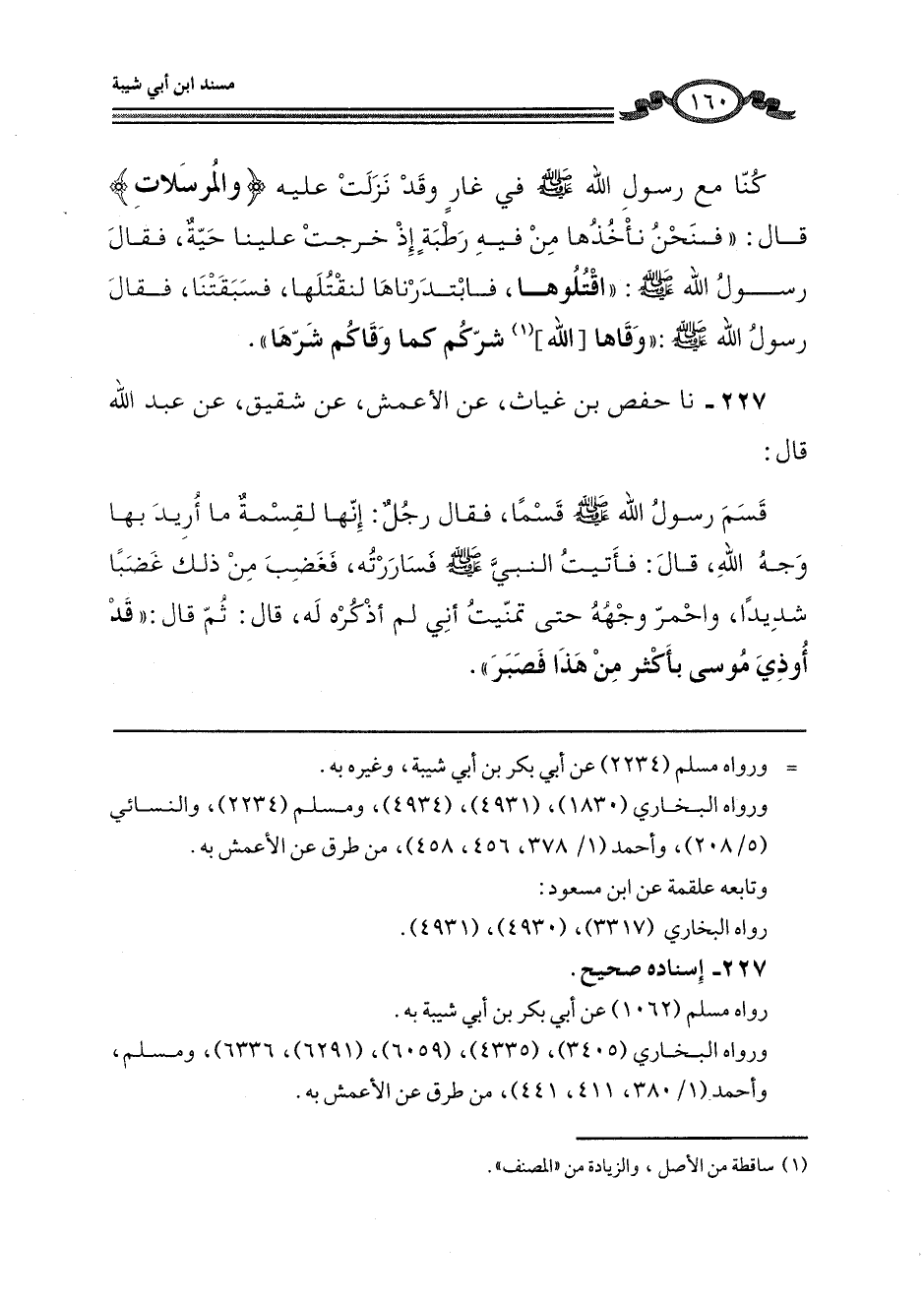 227 - نا حَفْصُ بْنُ غِيَاثٍ، عَنِ الْأَعْمَشِ، عَنْ شَقِيقٍ، عَنْ عَبْدِ اللَّهِ، قَالَ: قَسَمَ رَسُولُ اللَّهِ صَلَّى اللهُ عَلَيْهِ وَسَلَّمَ قَسْمًا، فَقَالَ رَجُلٌ: إِنَّهَا لَقِسْمَةٌ مَا أُرِيدَ بِهَا وَجْهَ اللَّهِ، قَالَ: فَأَتَيْتُ النَّبِيَّ صَلَّى اللهُ عَلَيْهِ وَسَلَّمَ فَسَارَرْتُهُ، فَغَضِبَ مِنْ ذَلِكَ غَضَبًا شَدِيدًا، وَاحْمَرَّ وَجْهُهُ حَتَّى تَمَنَّيْتُ أَنِّي لَمْ أَذْكُرَهُ لَهُ، قَالَ: ثُمَّ قَالَ: «§قَدْ أُوذِيَ مُوسَى بِأَكْثَرَ مِنْ هَذَا فَصَبَرَ»