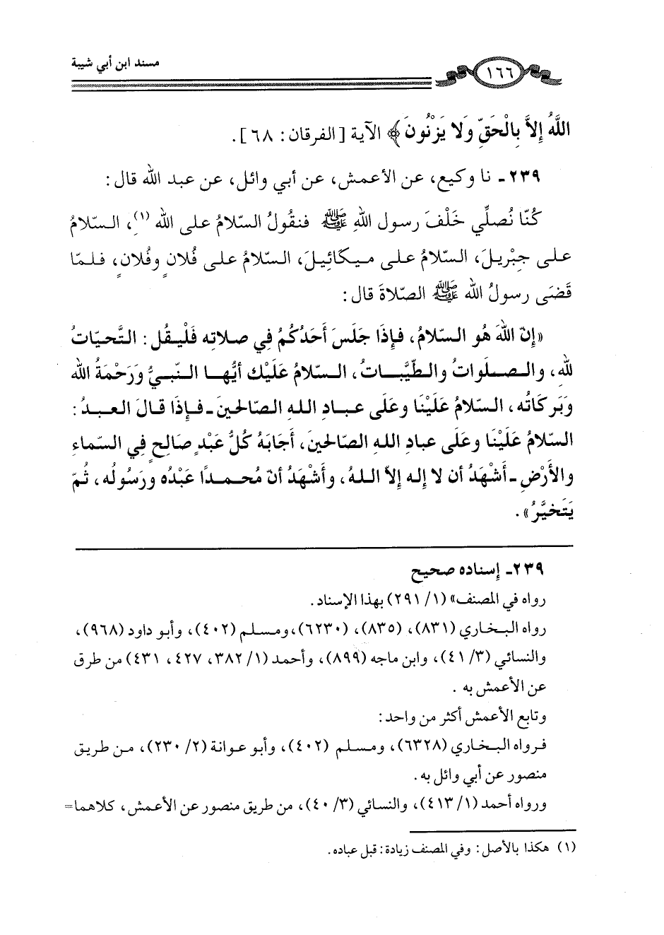 239 - نا وَكِيعٌ، عَنِ الْأَعْمَشِ، عَنْ أَبِي وَائِلٍ، عَنْ عَبْدِ اللَّهِ، قَالَ: كُنَّا نُصَلِّي خَلْفَ رَسُولِ اللَّهِ صَلَّى اللهُ عَلَيْهِ وَسَلَّمَ فَنَقُولُ: السَّلَامُ عَلَى اللَّهِ، السَّلَامُ عَلَى جِبْرِيلَ، السَّلَامُ عَلَى مِيكَائِيلَ، السَّلَامُ عَلَى فُلَانٍ وَفُلَانٍ، فَلَمَّا قَضَى رَسُولُ اللَّهِ صَلَّى اللهُ عَلَيْهِ وَسَلَّمَ الصَّلَاةَ قَالَ: " إِنَّ §اللَّهَ هُوَ السَّلَامُ، فَإِذَا جَلَسَ أَحَدُكُمْ فِي صَلَاتِهِ فَلْيَقُلِ: التَّحِيَّاتُ لِلَّهِ، وَالصَّلَوَاتُ وَالطَّيِّبَاتُ، السَّلَامُ عَلَيْكَ أَيُّهَا النَّبِيُّ وَرَحْمَةُ اللَّهِ وَبَرَكَاتُهُ، السَّلَامُ عَلَيْنَا وَعَلَى عِبَادِ اللَّهِ الصَّالِحِينَ - فَإِذَا قَالَ الْعَبْدُ: السَّلَامُ عَلَيْنَا وَعَلَى عِبَادِ اللَّهِ الصَّالِحِينَ، أَجَابَهُ كُلُّ عَبْدٌ صَالِحٌ فِي السَّمَاءِ وَالْأَرْضِ - أَشْهَدُ أَنْ لَا إِلَهَ إِلَّا اللَّهُ، وَأَشْهَدُ أَنَّ مُحَمَّدًا عَبْدُهُ وَرَسُولُهُ، ثُمَّ يَتَخَيَّرُ "