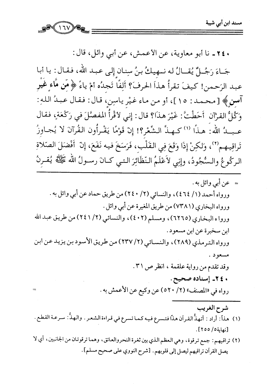 240 - نا أَبُو مُعَاوِيَةَ، عَنِ الْأَعْمَشِ، عَنْ أَبِي وَائِلٍ، قَالَ: جَاءَ رَجُلٌ يُقَالُ لَهُ نَهِيكُ بْنُ سِنَانٍ إِلَى عَبْدِ اللَّهِ، فَقَالَ: يَا أَبَا عَبْدِ الرَّحْمَنِ كَيْفَ تَقْرَأُ هَذَا الْحَرْفَ؟ أَلِفًا تَجِدُهُ أَمْ يَاءً {مِنْ مَاءٍ غَيْرِ آسِنٍ} [محمد: 15] ، أَوْ مِنْ مَاءٍ غَيْرِ يَاسِنٍ، قَالَ: فَقَالَ عَبْدُ اللَّهِ: وَكُلُّ الْقُرْآنِ أَحَطْتَ غَيْرَ هَذَا؟، قَالَ: " إِنِّي لَأَقْرَأُ الْمُفَصَّلَ فِي رَكْعَةٍ، فَقَالَ عَبْدُ اللَّهِ: هَذًّا كَهَذِّ الشِّعْرِ؟ إِنَّ قَوْمًا يَقْرَءُونَ الْقُرْآنَ لَا يُجَاوِزُ تَرَاقِيَهُمْ، وَلَكِنْ إِذَا وَقَعَ فِي الْقَلْبِ، فَرَسَخَ فِيهِ نَفَعَ، إِنَّ §أَفْضَلَ الصَّلَاةِ الرُّكُوعُ وَالسُّجُودُ، وَإِنِّي لَأَعْلَمُ النَّظَائِرَ الَّتِي كَانَ رَسُولُ اللَّهِ صَلَّى اللهُ عَلَيْهِ وَسَلَّمَ يَقْرُنُ -[168]- بَيْنَهُنَّ، سُورَتَيْنِ فِي كُلِّ رَكْعَةٍ "، ثُمَّ قَامَ عَبْدُ اللَّهِ فَدَخَلَ عَلْقَمَةُ فِي إِثْرِهِ، ثُمَّ خَرَجَ فَقَالَ: أَخْبِرْنِي بِهَا