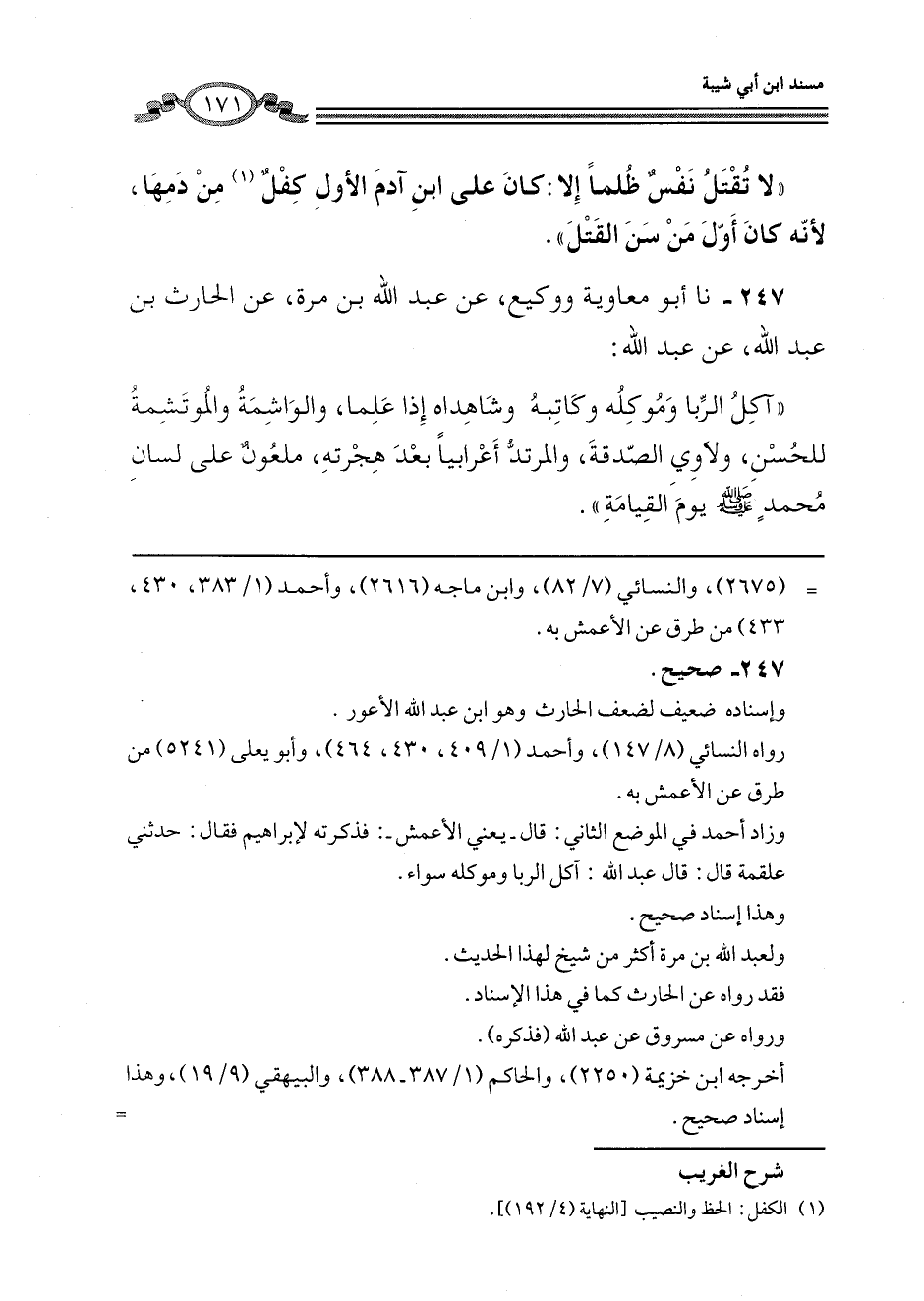 247 - نا أَبُو مُعَاوِيَةَ، وَوَكِيعٌ، عَنْ عَبْدِ اللَّهِ بْنِ مُرَّةَ، عَنِ الْحَارِثِ بْنِ عَبْدِ اللَّهِ، عَنْ عَبْدِ اللَّهِ: «§آكِلُ الرِّبَا وَمُوكِلُهُ وَكَاتِبُهُ، وَشَاهِدَاهُ إِذَا عَلِمَا، وَالْوَاشِمَةُ وَالْمُوتَشِمَةُ لِلْحُسْنِ، وَلَاوِي الصَّدَقَةِ، وَالْمُرْتَدُّ أَعْرَابِيًّا بَعْدَ هِجْرَتِهِ، مَلْعُونٌ عَلَى لِسَانِ مُحَمَّدٍ صَلَّى اللهُ عَلَيْهِ وَسَلَّمَ يَوْمَ الْقِيَامَةِ»