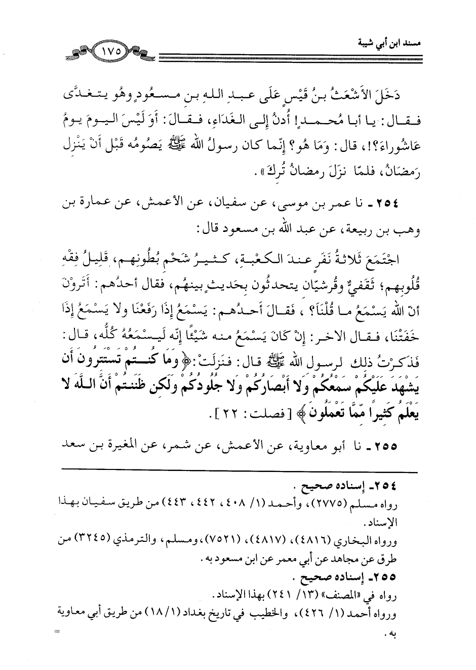 254 - نا عُمَرُ بْنُ مُوسَى، عَنْ سُفْيَانَ، عَنِ الْأَعْمَشِ، عَنْ عُمَارَةَ عَنْ وهْبِ بْنِ رَبِيعَةَ، عَنْ عَبْدِ اللَّهِ بْنِ مَسْعُودٍ، قَالَ: " اجْتَمَعَ ثَلَاثَةُ نَفَرٍ عِنْدَ الْكَعْبَةِ، كَثِيرُ شَحْمِ بُطُونِهِمْ، قَلِيلُ فِقْهِ قُلُوبِهِمْ، ثَقَفِيٌّ وَقُرَشِيَّانِ يَتَحَدَّثُونَ بِحَدِيثٍ بَيْنَهُمْ، فَقَالَ أَحَدُهُمْ: §أَتَرَوْنَ أَنَّ اللَّهَ يَسْمَعُ مَا قُلْنَا؟، فَقَالَ أَحَدُهُمْ: يَسْمَعُ إِذَا رَفَعْنَا وَلَا يَسْمَعُ إِذَا خَفَتْنَا، فَقَالَ الْآخَرُ: إِنْ كَانَ يَسْمَعُ مِنْهُ شَيْئًا إِنَّهُ لَيَسْمَعُهُ كُلَّهُ "، قَالَ: فَذَكَرْتُ ذَلِكَ لِرَسُولِ اللَّهِ صَلَّى اللهُ عَلَيْهِ وَسَلَّمَ قَالَ: فَنَزَلَتْ: {وَمَا كُنْتُمْ تَسْتَتِرُونَ أَنْ يَشْهَدَ عَلَيْكُمْ سَمْعُكُمْ وَلَا أَبْصَارُكُمْ وَلَا جُلُودُكُمْ وَلَكِنْ ظَنَنْتُمْ أَنَّ اللَّهَ لَا يَعْلَمُ كَثِيرًا مِمَّا تَعْمَلُونَ} [فصلت: 22]
