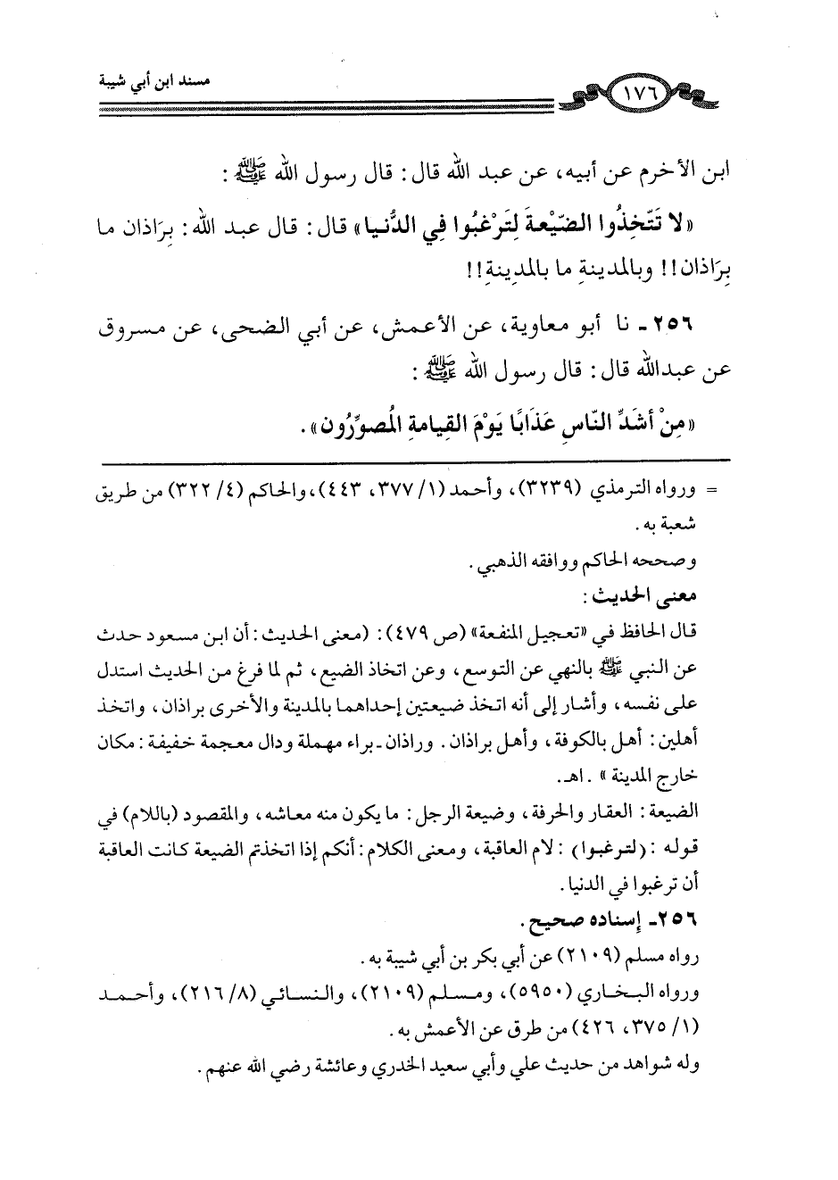 256 - نا أَبُو مُعَاوِيَةَ، عَنِ الْأَعْمَشِ، عَنْ أَبِي الضُّحَى، عَنْ مَسْرُوقٍ، عَنْ عَبْدِ اللَّهِ، قَالَ: قَالَ رَسُولُ اللَّهِ صَلَّى اللهُ عَلَيْهِ وَسَلَّمَ: «§مِنْ أَشَدِّ النَّاسِ عَذَابًا يَوْمَ الْقِيَامَةِ الْمُصَوِّرُونَ»