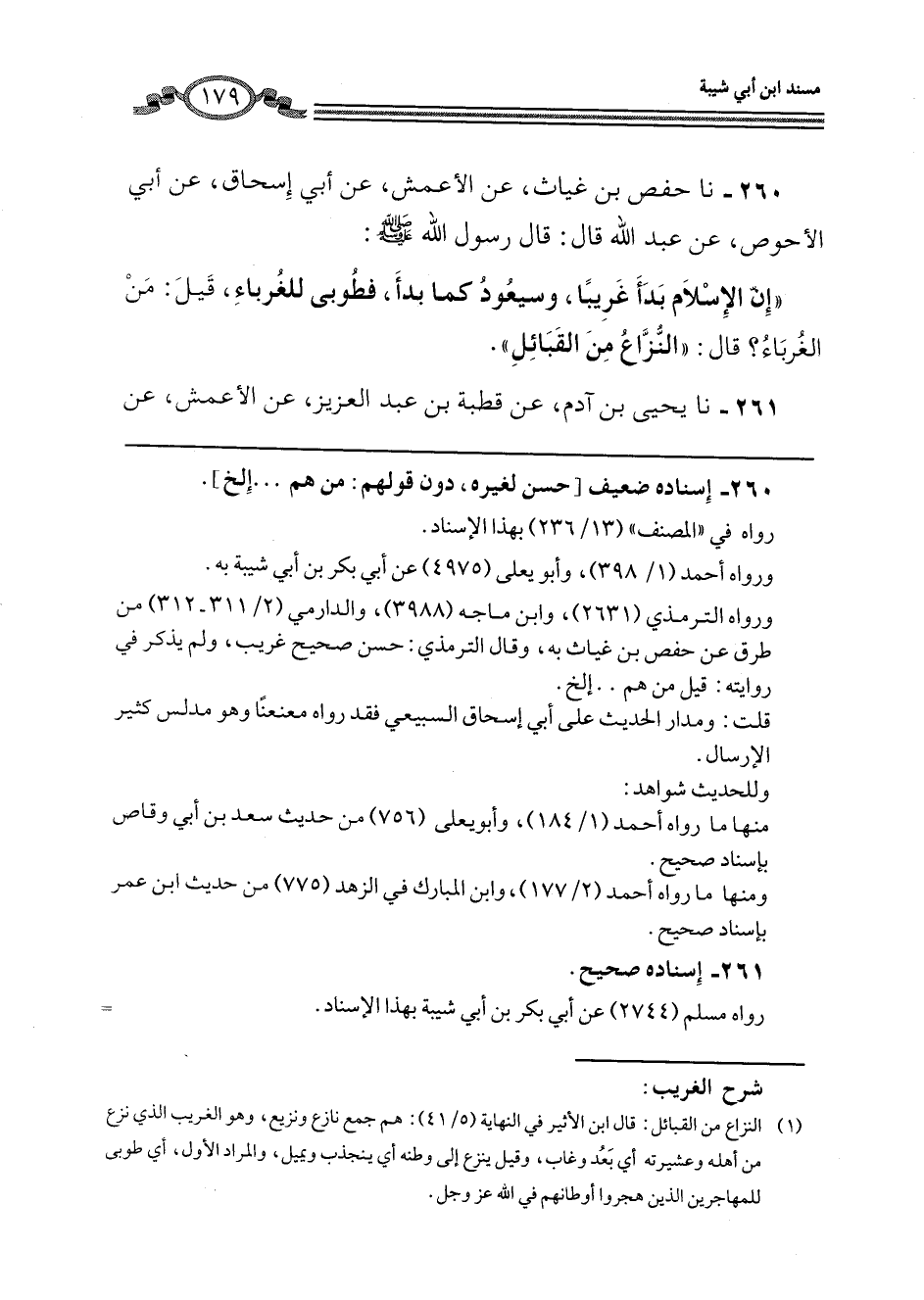 260 - نا حَفْصُ بْنُ غِيَاثٍ، عَنِ الْأَعْمَشِ، عَنْ أَبِي إِسْحَاقَ، عَنْ أَبِي الْأَحْوَصِ، عَنْ عَبْدِ اللَّهِ، قَالَ: قَالَ رَسُولُ اللَّهِ صَلَّى اللهُ عَلَيْهِ وَسَلَّمَ: " إِنَّ §الْإِسْلَامَ بَدَأَ غَرِيبًا، وَسَيَعُودُ كَمَا بَدَأَ، فَطُوبَى لِلْغُرَبَاءِ، قِيلَ: مَنِ الْغُرَبَاءُ؟ قَالَ: «النُّزَّاعُ مِنَ الْقَبَائِلِ»