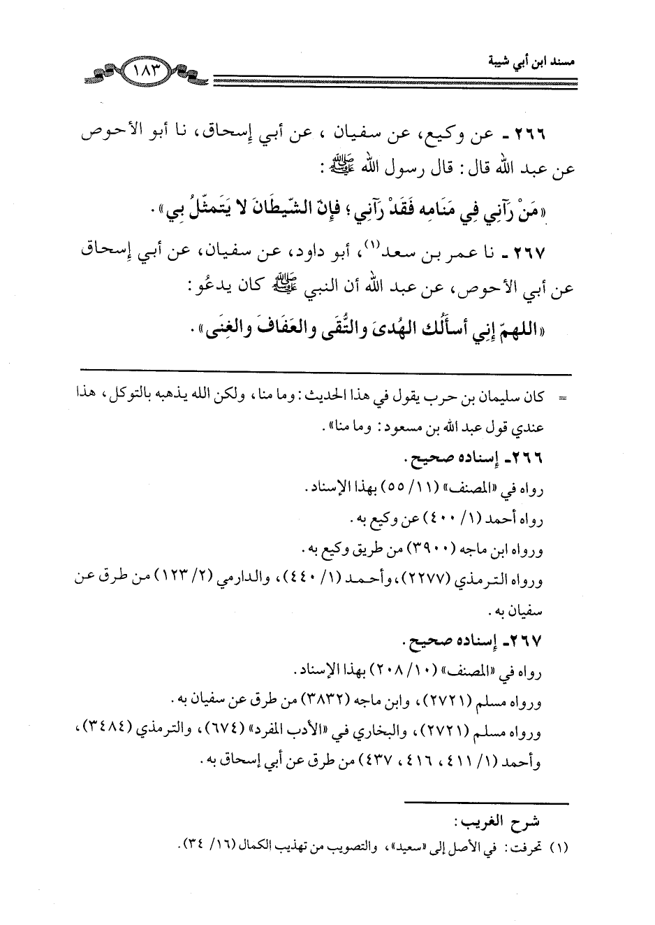 266 - عَنْ وَكِيعٍ، عَنْ سُفْيَانَ، عَنْ أَبِي إِسْحَاقَ، نَا أَبُو الْأَحْوَصِ، عَنْ عَبْدِ اللَّهِ، قَالَ: قَالَ رَسُولُ اللَّهِ صَلَّى اللهُ عَلَيْهِ وَسَلَّمَ: «§مَنْ رَآنِي فِي مِنَامِهِ فَقَدْ رَآنِي، فَإِنَّ الشَّيْطَانَ لَا يَتَمَثَّلُ بِي»