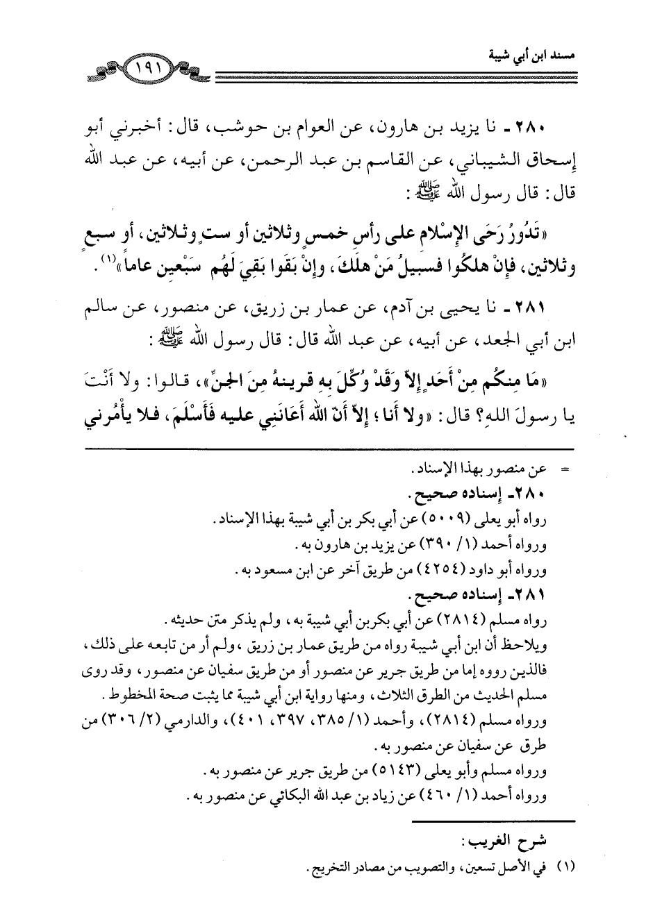 280 - نا يَزِيدُ بْنُ هَارُونَ، عَنِ الْعَوَّامِ بْنِ حَوْشَبٍ، قَالَ: أَخْبَرَنِي أَبُو إِسْحَاقَ الشَّيْبَانِيُّ، عَنِ الْقَاسِمِ بْنِ عَبْدِ الرَّحْمَنِ، عَنْ أَبِيهِ، عَنْ عَبْدِ اللَّهِ، قَالَ: قَالَ رَسُولُ اللَّهِ صَلَّى اللهُ عَلَيْهِ وَسَلَّمَ: «§تَدُورُ رَحَى الْإِسْلَامِ عَلَى رَأْسِ خَمْسٍ وَثَلَاثِينَ، أَوْ سِتٍّ وَثَلَاثِينَ، أَوْ سَبْعٍ وَثَلَاثِينَ، فَإِنْ هَلَكُوا فَسَبِيلُ مَنْ هَلَكَ، وَإِنْ بَقَوْا بَقِيَ لَهُمْ سَبْعِينَ عَامًا»