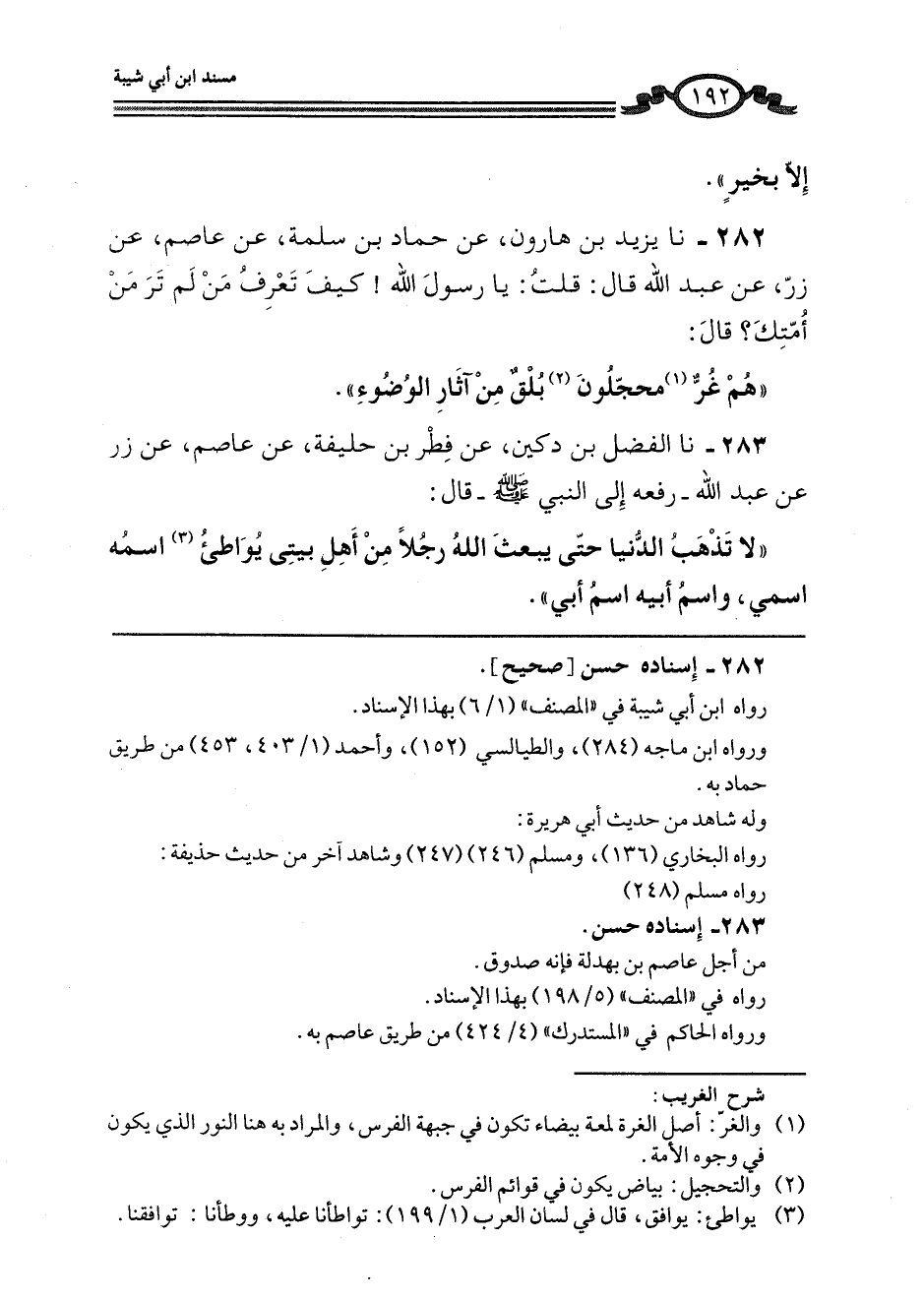 282 - نا يَزِيدُ بْنُ هَارُونَ، عَنْ حَمَّادِ بْنِ سَلَمَةَ، عَنْ عَاصِمٍ، عَنْ زِرٍّ، عَنْ عَبْدِ اللَّهِ، قَالَ: قُلْتُ: يَا رَسُولَ اللَّهِ كَيْفَ تَعْرِفُ مَنْ لَمْ تَرَ مِنْ أُمَّتِكَ؟ قَالَ: «§هُمْ غُرٌّ مُحَجَّلُونَ بُلْقٌ مِنْ آثَارِ الْوُضُوءِ»