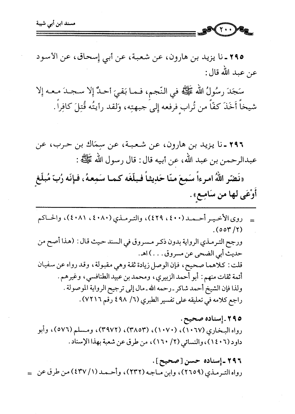 295 - نا يَزِيدُ بْنُ هَارُونَ، عَنْ شُعْبَةَ، عَنْ أَبِي إِسْحَاقَ، عَنِ الْأَسْوَدِ، عَنْ عَبْدِ اللَّهِ، قَالَ: «§سَجَدَ رَسُولُ اللَّهِ صَلَّى اللهُ عَلَيْهِ وَسَلَّمَ فِي النَّجْمِ، فَمَا بَقِيَ أَحَدٌ إِلَّا سَجَدَ مَعَهُ، إِلَّا شَيْخًا أَخَذَ كَفًّا مِنْ تُرَابِ فَرَفَعَهُ إِلَى جَبْهَتِهِ، وَلَقَدْ رَأَيْتُهُ قُتِلَ كَافِرًا»