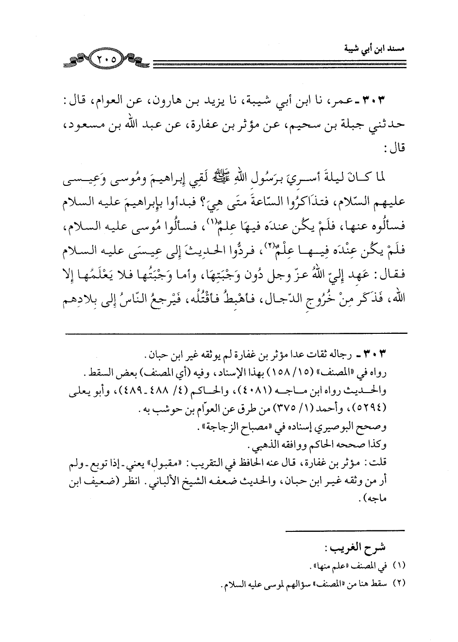 303 - عُمَرُ، نا ابْنُ أَبِي شَيْبَةَ، نا يَزِيدُ بْنُ هَارُونَ، عَنِ الْعَوَّامِ، قَالَ: حَدَّثَنِي جَبَلَةُ بْنُ سُحَيْمٍ، عَنْ مُؤْثِرِ بْنِ عَفَارَةَ، عَنْ عَبْدِ اللَّهِ بْنِ مَسْعُودٍ، قَالَ: " لَمَّا كَانَ لَيْلَةَ أُسْرِيَ بِرَسُولِ اللَّهِ صَلَّى اللهُ عَلَيْهِ وَسَلَّمَ لَقِيَ إِبْرَاهِيمَ وَمُوسَى وَعِيسَى عَلَيْهِمُ السَّلَامُ، §فَتَذَاكَرُوا السَّاعَةَ مَتَى هِيَ؟ فَبَدَأُوا بِإِبْرَاهِيمَ عَلَيْهِ السَّلَامُ فَسَأَلُوهُ عَنْهَا، فَلَمْ يَكُنْ عِنْدَهُ فِيهَا عِلْمٌ، فَسَأَلُوا مُوسَى عَلَيْهِ السَّلَامُ فَلَمْ يَكُنْ عِنْدَهُ فِيهَا عِلْمٌ، فَرَدُّوا الْحَدِيثَ إِلَى عِيسَى عَلَيْهِ السَّلَامُ فَقَالَ: عَهِدَ إِلَيَّ اللَّهُ عَزَّ وَجَلَّ دُونَ وَجْبَتِهَا، وَأَمَّا وَجْبَتُهَا فَلَا يَعْلَمُهَا إِلَّا اللَّهُ، فَذَكَرَ مِنْ خُرُوجِ الدَّجَّالِ، فَأَهْبِطُ فَأَقْتُلُهُ، فَيَرْجِعُ النَّاسُ إِلَى بِلَادِهِمْ -[206]- فَيَسْتَقْبِلُهُمْ يَأْجُوجُ وَمَأْجُوجُ، وَهُمْ مِنْ كُلِّ حَدَبٍ يَنْسِلُونَ، لَا يَمُرُّونَ بِمَاءٍ إِلَّا شَرِبُوهُ، وَلَا شَيْءٍ إِلَّا أَفْسَدُوهُ، فَيَجْأَرُونَ إِلَيَّ، فَأَدْعُو اللَّهَ جَلَّ وَعَزَّ فَيُمِيتُهُمْ فَتَجْوَى الْأَرْضُ مِنْ رِيحِهِمْ، فَيَجْأَرُونَ إِلَيَّ فَأَدْعُو اللَّهَ، فَيُرْسِلُ السَّمَاءَ بِالْمَاءِ فَتَحْمِلُ أَجْسَادَهُمْ فَتُلْقِيهَا إِلَى الْبَحْرِ، ثُمَّ تُنْسَفُ الْجِبَالُ، وَتُمَدُّ الْأَرْضُ مَدَّ الْأَدِيمِ، ثُمَّ يَعْهَدُ اللَّهُ إِلَيَّ أَنَّهُ إِذَا كَانَ ذَلِكَ، فَإِنَّ السَّاعَةَ مِنَ النَّاسِ كَالْحَامِلِ الْمُتِمِّ، لَا يَدْرِي أَهْلُهَا تَفْجُؤَهُمْ بِوِلَادَتِهَا، لَيْلًا أَوْ نَهَارًا ". قَالَ الْعَوَّامُ: فَوَجَدْتُ تَصْدِيقَ ذَلِكَ فِي كِتَابِ اللَّهِ، وَقَرَأَ {حَتَّى إِذَا فُتِحَتْ يَأْجُوجُ وَمَأْجُوجُ وَهُمْ مِنْ كُلِّ حَدَبٍ يَنْسِلُونَ وَاقْتَرَبَ الْوَعْدُ الْحَقُّ} [الأنبياء: 97]