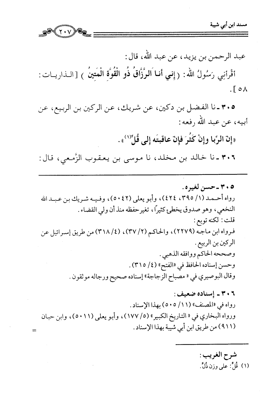 305 - نا الْفَضْلُ بْنُ دُكَيْنٍ، عَنْ شَرِيكٍ، عَنِ الرُّكَيْنِ بْنِ الرَّبِيعِ، عَنْ أَبِيهِ، عَنْ عَبْدِ اللَّهِ، رَفَعَهُ: «§إِنَّ الرِّبَا وَإِنْ كَثُرَ فَإِنَّ عَاقِبَتَهُ إِلَى قُلٍّ»