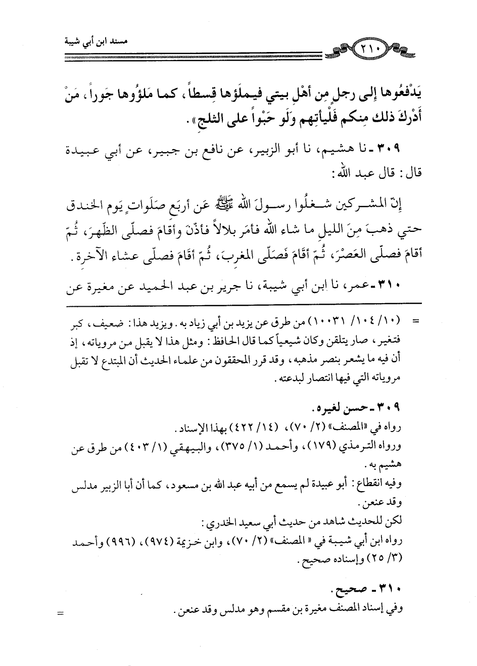309 - نا هُشَيْمٌ، نَا أَبُو الزُّبَيْرِ، عَنْ نَافِعِ بْنِ جُبَيْرٍ، عَنْ أَبِي عُبَيْدَةَ، قَالَ: قَالَ عَبْدُ اللَّهِ: «إِنَّ الْمُشْرِكِينَ §شَغَلُوا رَسُولَ اللَّهِ صَلَّى اللهُ عَلَيْهِ وَسَلَّمَ عَنْ أَرْبَعِ صَلَوَاتٍ يَوْمَ الْخَنْدَقِ حَتَّى ذَهَبَ مِنَ اللَّيْلِ مَا شَاءَ اللَّهُ، فَأَمَرَ بِلَالًا فَأَذَّنَ وَأَقَامَ فَصَلَّى الظُّهْرَ، ثُمَّ أَقَامَ فَصَلَّى الْعَصْرَ، ثُمَّ أَقَامَ فَصَلَّى الْمَغْرِبَ، ثُمَّ أَقَامَ فَصَلَّى عِشَاءَ الْآخِرَةِ»