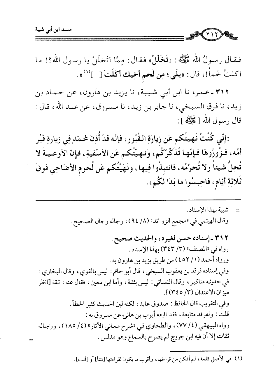 312 - عُمَرُ، نا ابْنُ أَبِي شَيْبَةَ، نا يَزِيدُ بْنُ هَارُونَ، عَنْ حَمَّادِ بْنِ زَيْدٍ، نَا فَرَقٌ السَّبَخِيُّ، نَا جَابِرُ بْنُ زَيْدٍ، نَا مَسْرُوقٌ، عَنْ عَبْدِ اللَّهِ، قَالَ: قَالَ رَسُولُ اللَّهِ صَلَّى اللهُ عَلَيْهِ وَسَلَّمَ: «إِنِّي كُنْتُ §نَهَيْتُكُمْ عَنْ زِيَارَةِ الْقُبُورِ، فَإِنَّهُ قَدْ أَذِنَ لِمُحَمَّدٍ فِي زِيَارَةِ قَبْرِ أُمِّهِ، فَزُورُوهَا فَإِنَّهَا تُذَكِّرُكُمْ، وَنَهَيْتُكُمْ عَنِ الْأَسْقِيَةِ، فَإِنَّ الْأَوْعِيَةَ لَا تَحِلُّ شَيْئًا وَلَا تُحَرِّمُهُ، فَانْتَبِذُوا فِيهَا، وَنَهَيْتُكُمْ عَنْ لُحُومِ الْأَضَاحِي فَوْقَ ثَلَاثَةِ أَيَّامٍ، فَاحْبِسُوا مَا بَدَا لَكُمْ»
