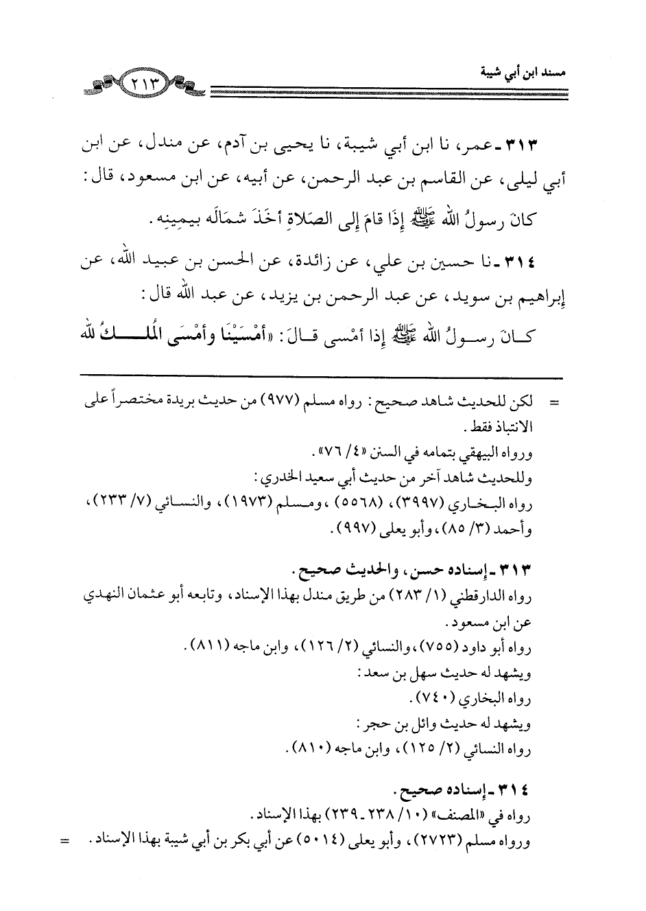 313 - عُمَرُ، نا ابْنُ أَبِي شَيْبَةَ، نا يَحْيَى بْنُ آدَمَ، عَنْ مِنْدَلٍ، عَنِ ابْنِ أَبِي لَيْلَى، عَنِ الْقَاسِمِ بْنِ عَبْدِ الرَّحْمَنِ، عَنْ أَبِيهِ، عَنِ ابْنِ مَسْعُودٍ، قَالَ: كَانَ رَسُولُ اللَّهِ صَلَّى اللهُ عَلَيْهِ وَسَلَّمَ «§إِذَا قَامَ إِلَى الصَّلَاةِ أَخَذَ شِمَالَهُ بِيَمِينِهِ»