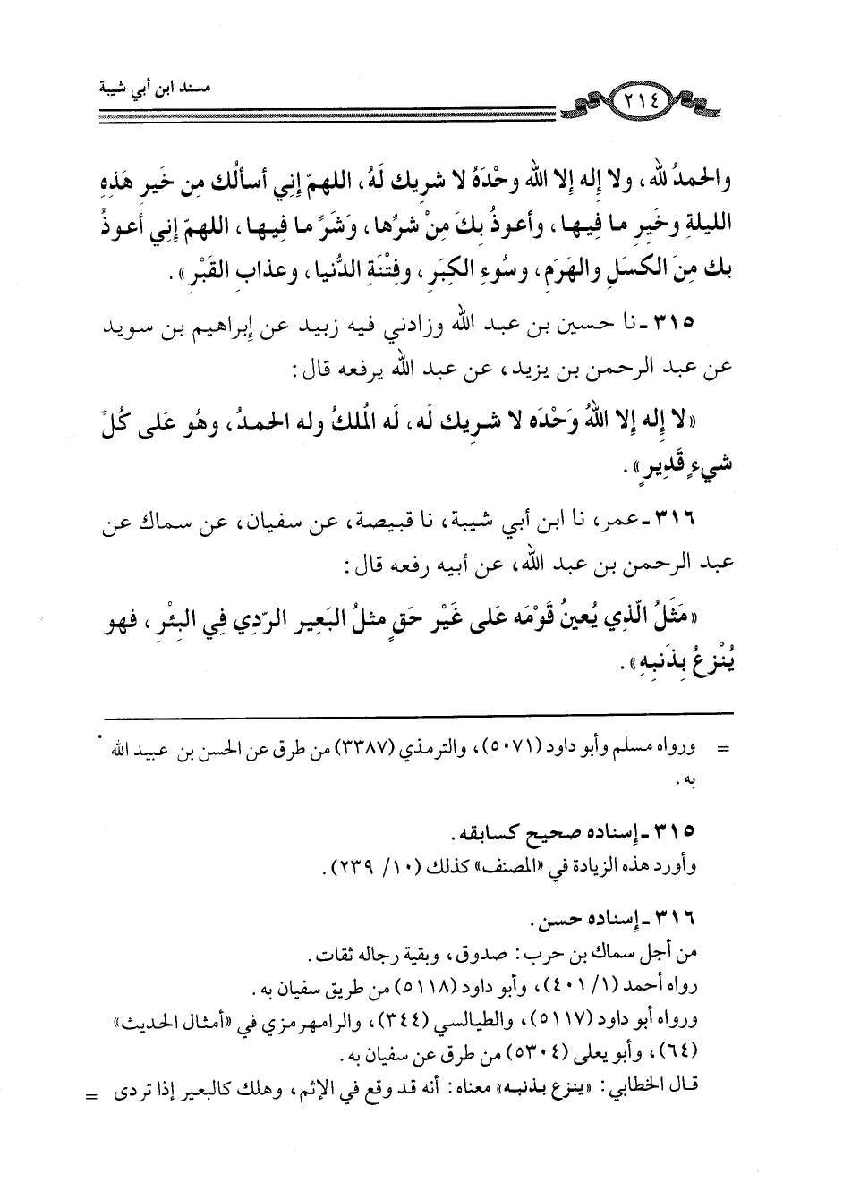 315 - نا حُسَيْنُ بْنُ عَبْدِ اللَّهِ، وَزَادَنِي فِيهِ زُبَيْدٌ، عَنْ إِبْرَاهِيمَ بْنِ سُوَيْدٍ، عَنْ عَبْدِ الرَّحْمَنِ بْنِ يَزِيدَ، عَنْ عَبْدِ اللَّهِ، يَرْفَعُهُ قَالَ: «§لَا إِلَهَ إِلَّا اللَّهُ وَحْدَهُ لَا شَرِيكَ لَهُ، لَهُ الْمُلْكُ وَلَهُ الْحَمْدُ، وَهُوَ عَلَى كُلِّ شَيْءٍ قَدِيرٌ»