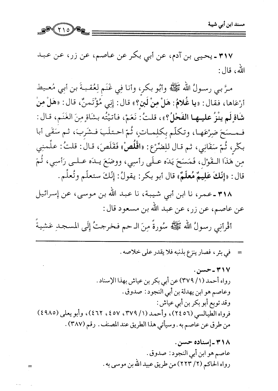 317 - يَحْيَى بْنُ آدَمَ، عَنْ أَبِي بَكْرٍ، عَنْ عَاصِمٍ، عَنْ زِرٍّ، عَنْ عَبْدِ اللَّهِ، قَالَ: مَرَّ بِي رَسُولُ اللَّهِ صَلَّى اللهُ عَلَيْهِ وَسَلَّمَ وَأَبُو بَكْرٍ، وَأَنَا فِي غَنَمٍ لِعُقْبَةَ بْنِ أَبِي مُعَيْطٍ أَرْعَاهَا، فَقَالَ: " يَا غُلَامُ: §هَلْ مِنْ لَبَنٍ؟ " قَالَ: إِنِّي مُؤْتَمَنٌ، قَالَ: «هَلْ مِنْ شَاةٍ لَمْ يَنْزُ عَلَيْهَا الْفَحْلُ؟» ، قُلْتُ: نَعَمْ، فَأَتَيْتُهُ بِشَاةٍ مِنَ الْغَنَمِ، قَالَ: فَمَسَحَ ضَرْعَهَا، وَتَكَلَّمَ بِكَلِمَاتٍ، ثُمَّ احْتَلَبَ فَشَرِبَ، ثُمَّ سَقَى أَبَا بَكْرٍ، ثُمَّ سَقَانِي، ثُمَّ قَالَ لِلضَّرْعِ: «اقْلُصْ» فَقَلَصَ، قَالَ: قُلْتُ: عَلِّمْنِي مِنْ هَذَا الْقَوْلِ، فَمَسَحَ يَدَهُ عَلَى رَأْسِي، وَوَضَعَ يَدَهُ عَلَى رَأْسِي، ثُمَّ قَالَ: «إِنَّكَ عَلِيمٌ مُعَلَّمٌ» قَالَ أَبُو بَكْرٍ: يَقُولُ: إِنَّكَ سَتَعْلَمُ وَتُعَلِّمُ