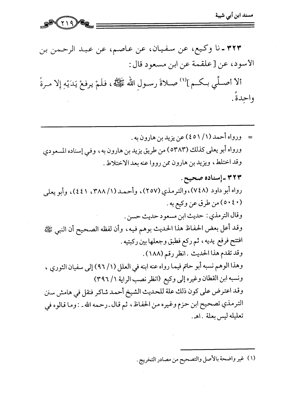 323 - نا وَكِيعٌ، عَنْ سُفْيَانَ، عَنْ عَاصِمٍ، عَنْ عَبْدِ الرَّحْمَنِ بْنِ الْأَسْوَدِ، عَنْ عَلْقَمَةَ، عَنِ ابْنِ مَسْعُودٍ، قَالَ: أَلَا أُصَلِّي بِكُمْ صَلَاةَ رَسُولِ اللَّهِ صَلَّى اللهُ عَلَيْهِ وَسَلَّمَ، «§فَلَمْ يَرْفَعْ يَدَيْهِ إِلَّا مَرَّةً وَاحِدَةً»