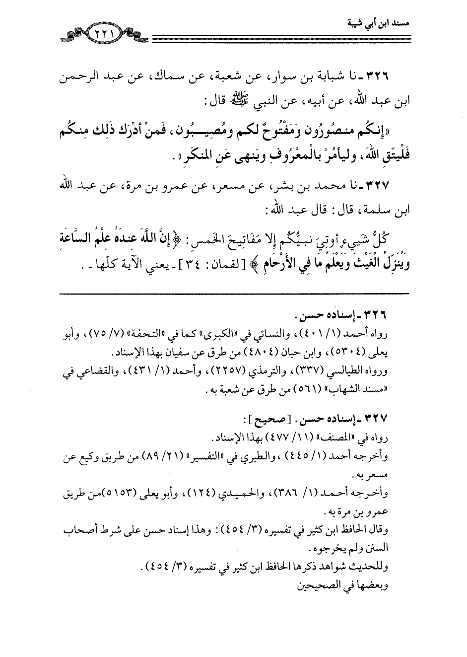 326 - نا شَبَابَةُ بْنُ سَوَّارٍ، عَنْ شُعْبَةَ، عَنْ سِمَاكٍ، عَنْ عَبْدِ الرَّحْمَنِ بْنِ عَبْدِ اللَّهِ، عَنْ أَبِيهِ، عَنِ النَّبِيِّ صَلَّى اللهُ عَلَيْهِ وَسَلَّمَ قَالَ: «§إِنَّكُمْ مَنْصُورُونَ وَمَفْتُوحٌ لَكُمْ وَمُصِيبُونَ، فَمَنْ أَدْرَكَ ذَلِكَ مِنْكُمْ فَلْيَتَّقِ اللَّهَ، وَلَيَأْمُرْ بِالْمَعْرُوفِ، وَيَنْهَى عَنِ الْمُنْكَرِ»