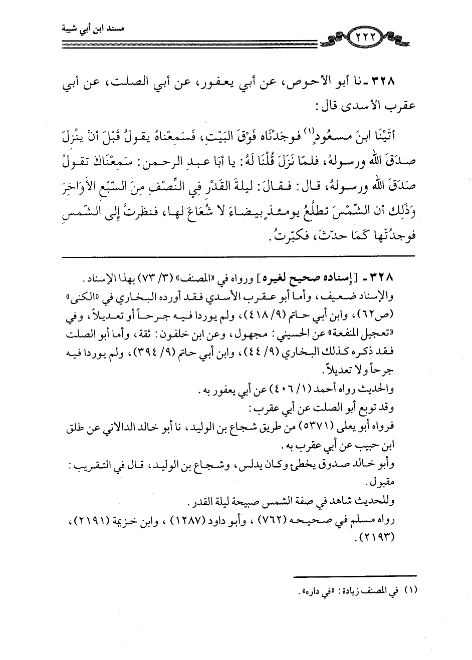 328 - نا أَبُو الْأَحْوَصِ، عَنْ أَبِي يَعْفُورٍ، عَنْ أَبِي الصَّلْتِ، عَنْ أَبِي عَقْرَبٍ الْأَسَدِيِّ، قَالَ: أَتَيْنَا ابْنَ مَسْعُودٍ فَوَجَدْنَاهُ فَوْقَ الْبَيْتِ، فَسَمِعْنَاهُ يَقُولُ قَبْلَ أَنْ يَنْزِلَ: صَدَقَ اللَّهُ وَرَسُولُهُ، فَلَمَّا نَزَلَ قُلْنَا لَهُ: يَا أَبَا عَبْدِ الرَّحْمَنِ سَمِعْنَاكَ تَقُولُ: صَدَقَ اللَّهُ وَرَسُولُهُ، قَالَ: فَقَالَ: «§لَيْلَةَ الْقَدْرِ فِي النِّصْفِ مِنَ السَّبْعِ الْأَوَاخِرِ، وَذَلِكَ أَنَّ الشَّمْسَ تَطْلُعُ يَوْمَئِذٍ بَيْضَاءَ لَا شُعَاعَ لَهَا» ، فَنَظَرْتُ إِلَى الشَّمْسِ فَوَجَدْتُهَا كَمَا حَدَّثَ، فَكَبَّرْتُ