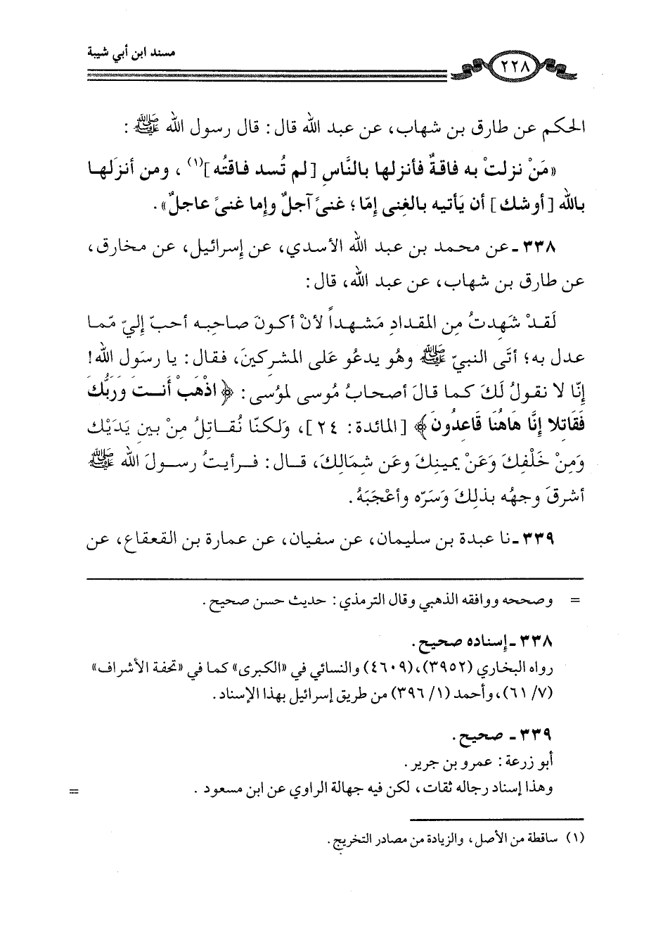 338 - عَنْ مُحَمَّدِ بْنِ عَبْدِ اللَّهِ الْأَسَدِيِّ، عَنْ إِسْرَائِيلَ، عَنْ مُخَارِقٍ، عَنْ طَارِقِ بْنِ شِهَابٍ، عَنْ عَبْدِ اللَّهِ، قَالَ: لَقَدْ شَهِدْتُ مِنَ الْمِقْدَادِ مَشْهَدًا لَأَنْ أَكُونَ صَاحِبُهُ أَحَبَّ إِلَيَّ مِمَّا عُدِلَ بِهِ، أَتَى النَّبِيَّ صَلَّى اللهُ عَلَيْهِ وَسَلَّمَ وَهُوَ يَدْعُو عَلَى الْمُشْرِكِينَ، فَقَالَ: " يَا رَسُولَ اللَّهِ إِنَّا لَا نَقُولُ لَكَ كَمَا قَالَ أَصْحَابُ مُوسَى لِمُوسَى: {اذْهَبْ أَنْتَ وَرَبُّكَ فَقَاتِلَا إِنَّا هَاهُنَا قَاعِدُونَ} ، وَلَكِنَّا §نُقَاتِلُ مِنْ بَيْنِ يَدَيْكَ، وَمِنْ خَلْفِكَ، وَعَنْ يَمِينِكَ، وَعَنْ شِمَالِكَ، قَالَ: فَرَأَيْتُ رَسُولَ اللَّهِ صَلَّى اللهُ عَلَيْهِ وَسَلَّمَ أَشْرَقَ وَجْهُهُ بِذَلِكَ وَسَرَّهُ وَأَعْجَبَهُ "